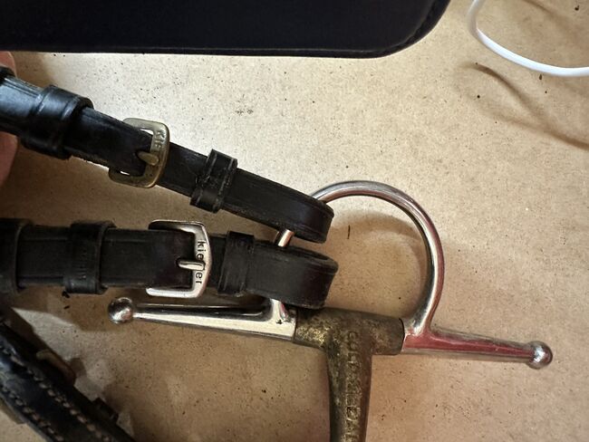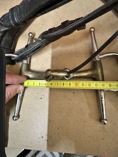 Snaffle hoofdstel - Hoofdstel en teugels van KIEFFER, schenkelhoofdstel 13,5 cm van Gold Medal, zwarte glittersterren in goud gezet op de frontriem Opgevuld bij de nek, neus en aan de onderkant Goed onderhouden gebruikte staat