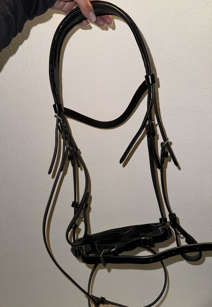 Snaffle hoofdstel WB - als nieuw - anatomisch & chique met gouden steentjes - Ik bied een zo goed als nieuw hoofdstel aan in de maat WB (warmbloed) - slechts één keer gedragen, zonder zichtbare gebruikssporen.