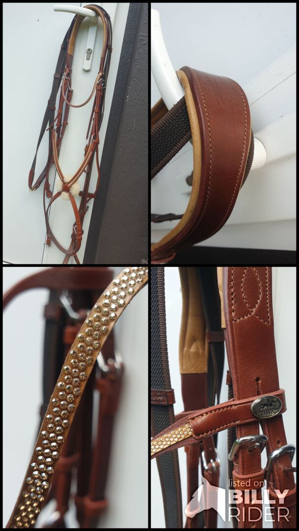 Zelden gebruikt omdat het te groot was voor mijn paard. Maat WB, maar zeer royaal gesneden. Bijpassende kleur teugels van BR inbegrepen.