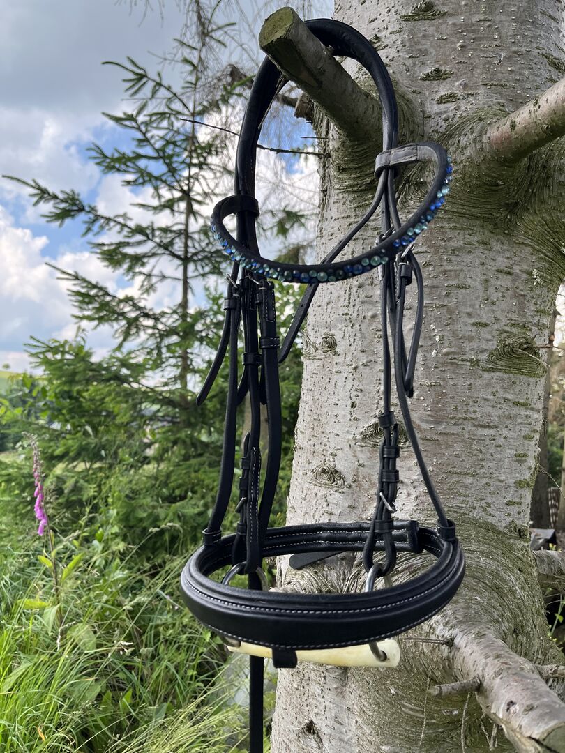 Snaffle Vol - Weinig gebruikte snaffel met wit sierstiksel, het bit (zuiver rubberen stang in 12,5) kan op verzoek worden aangeschaft.