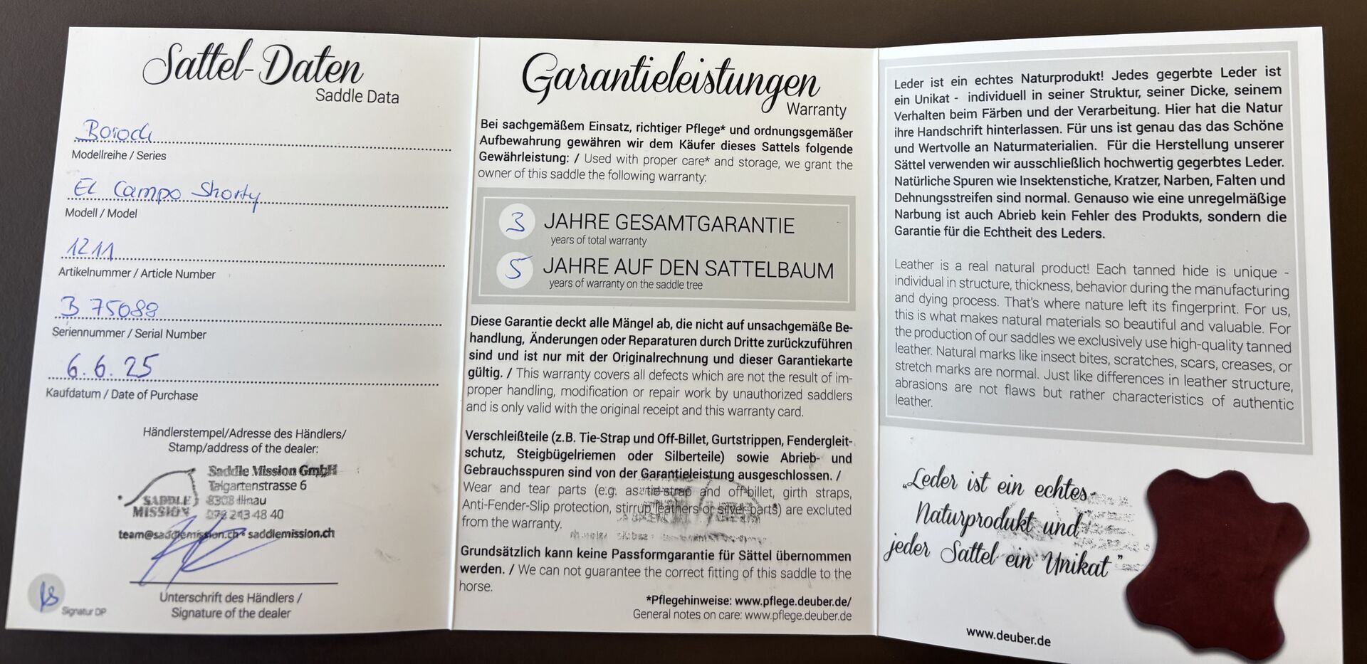 Ich verkaufe meinen Deuber El Campo Shorty, Kaufdatum 06.06.2025 (Sattelpass).