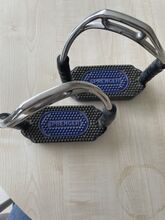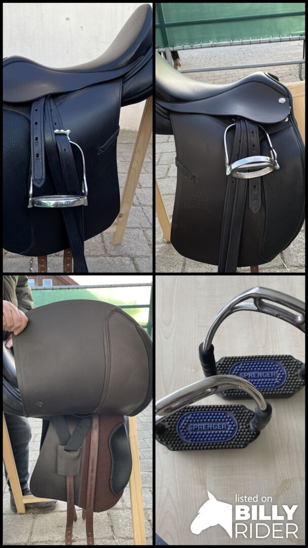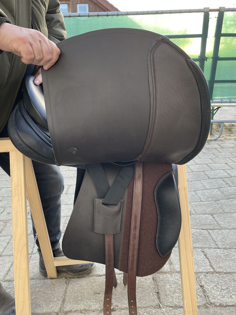 Het zadel is zoals op de foto's, maar inclusief stijgbeugelriemen en veiligheidsbeugels (niet die op de zadelfoto, maar los).