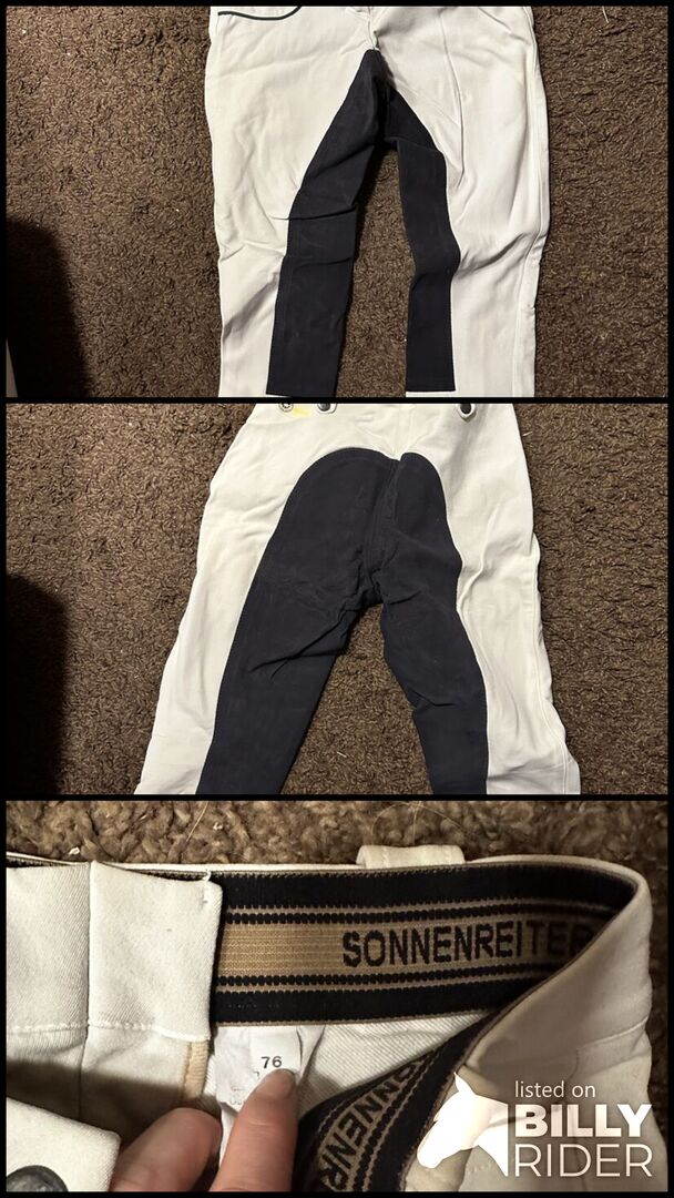 Sonnenreiter wedstrijdbroek - Ik verkoop mijn ooit gedragen Sonnenreiter wedstrijdrijbroek in maat 76. De broek heeft een antraciet lederen zitvlak en antracietkleurige applicaties. Geen garantie, retour, garantie, als particuliere verkoop. Zie ook mijn andere advertenties.