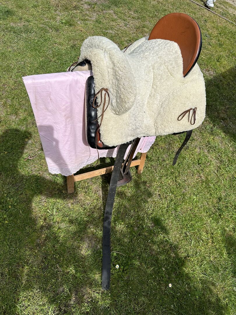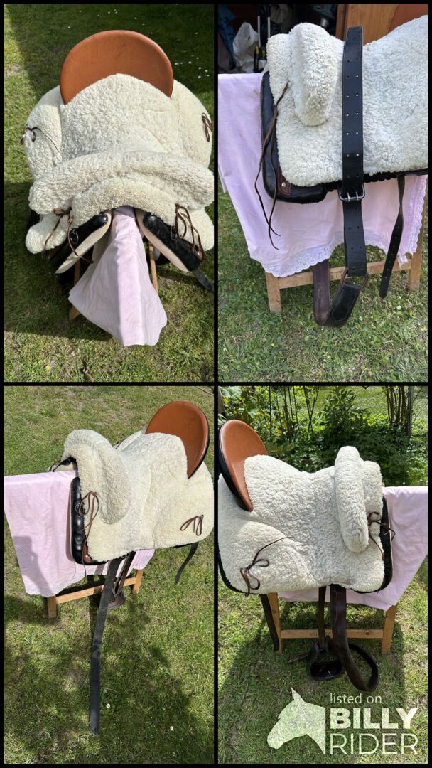 Het zadel heeft een flexibele boom en zou moeten passen op slanke en normaal gebouwde paarden met een gemiddelde breedte. De zadelmaat is vergelijkbaar met de 17 inch zadelmaat van klassieke zadels (maat tussen de galerijen ca. 35 cm). Het zadel is relatief kort (ca. 50 cm) en past daarom ook goed op typisch Spaanse paarden en vergelijkbare paardentypen. Wij hadden dit zadel op onze warmbloedmerrie, die iets sterker was! Het zadel is uit de eerste hand gekocht! De vorige eigenaren kochten het rechtstreeks in Spanje! Nieuwprijs 1600€