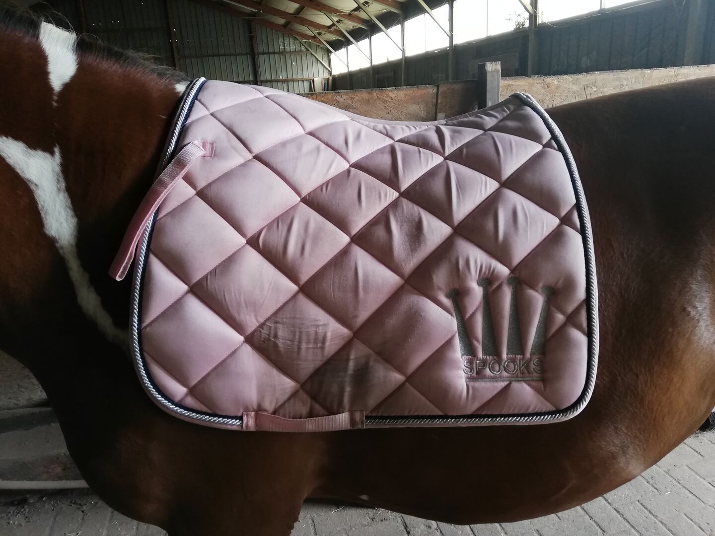Spooks Zadeldekje DL + Bandageset - Te koop is mijn Spooks in DL met bijpassende bandages! Het zadeldek heeft geen beschadigingen of iets dergelijks, maar is erg vies. Ik zou het opnieuw kunnen wassen voordat ik het verkoop. De bandages zijn ook in goede staat maar ook erg vies maar dat is natuurlijk gebruikelijk :)