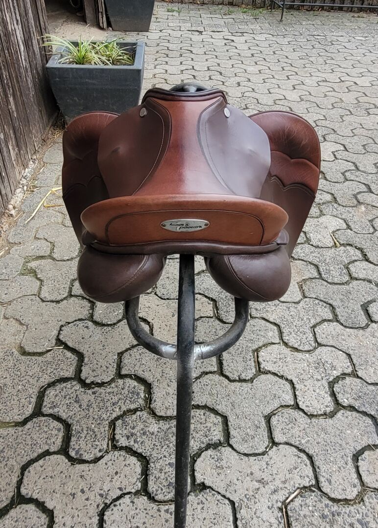 Springzadel - Mooi en goed onderhouden Horse & Passion (submerk van Kieffer) springzadel in bruin te koop. Klittenbandrollen voor ideale aanpassing van de dijbeenpositie. Achterste knierollen zijn beschikbaar. Alle verdere informatie is te vinden op de foto's.