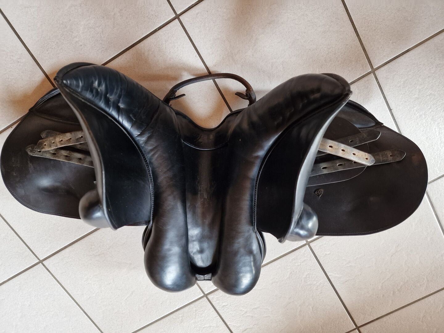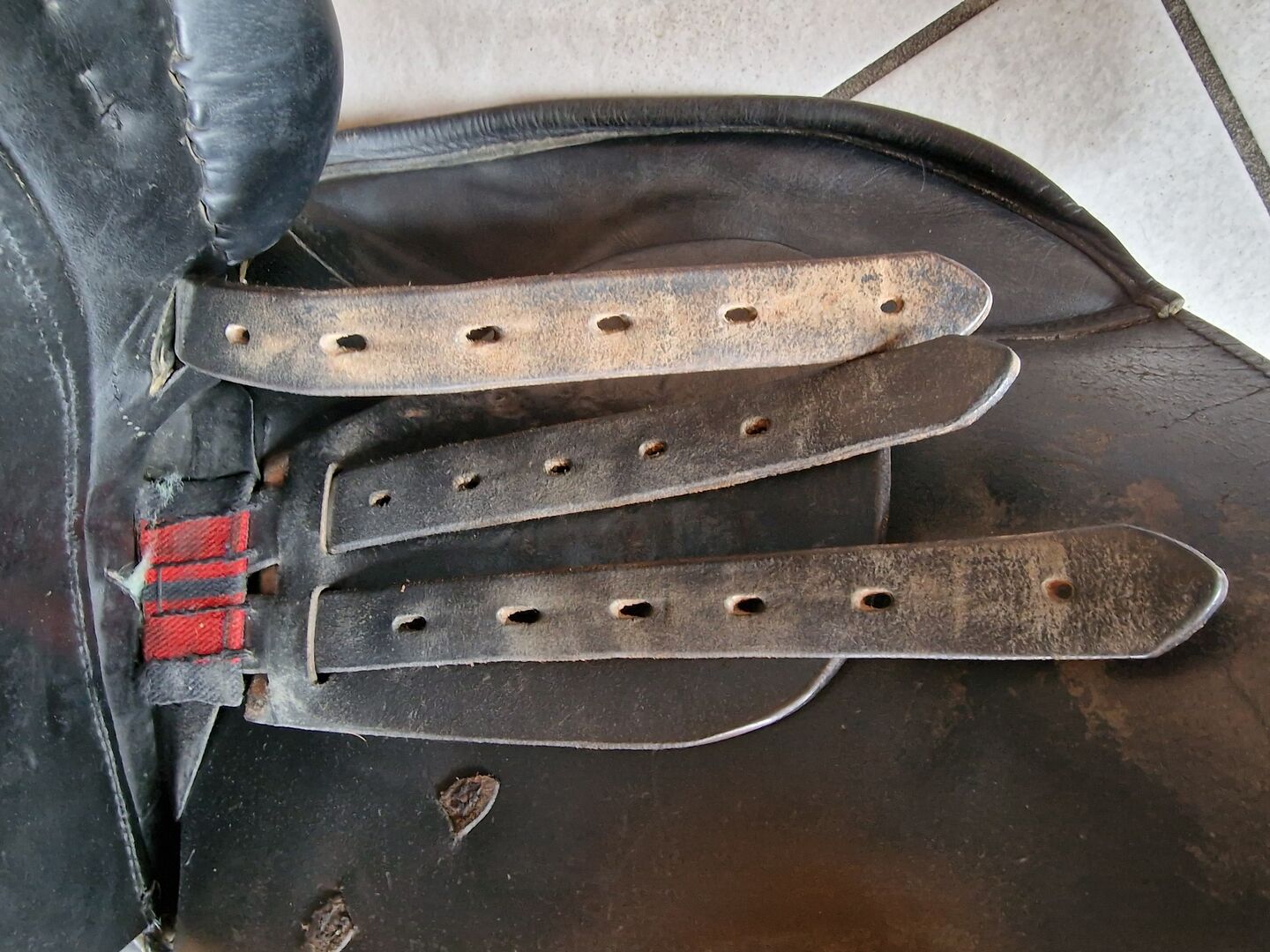 Springzadel - Springzadel met kleine gebruikssporen, dat ik ongeveer 3 jaar geleden in deze staat heb gekocht. Voor de rest is het een bruikbaar zadel waar ik altijd goed voor heb gezorgd. Ik heb het heel weinig gebruikt. De zit is niet ingestanst, ik schat 16,5, meer voor tengere ruiters. Een licht zadel waarmee je dicht op het paard zit. Meer voor paarden met een lage schoft. Ik had het op mijn Haflinger van 1.48.
