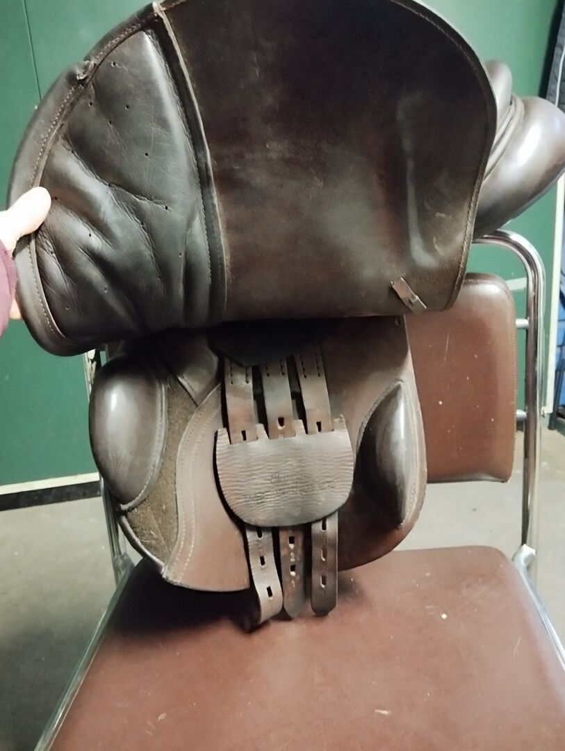 Springzadel bruin County - Goed onderhouden springzadel uit de provincie. Het zadel is ongeveer 10 jaar oud en goed verzorgd. Het is 1,5 jaar geleden opnieuw opgevuld. Past bijna elk paard. Bijpassende stijgbeugelriemen, een zwarte neopreen singel, stijgbeugels en een zadeldekje zijn inbegrepen.