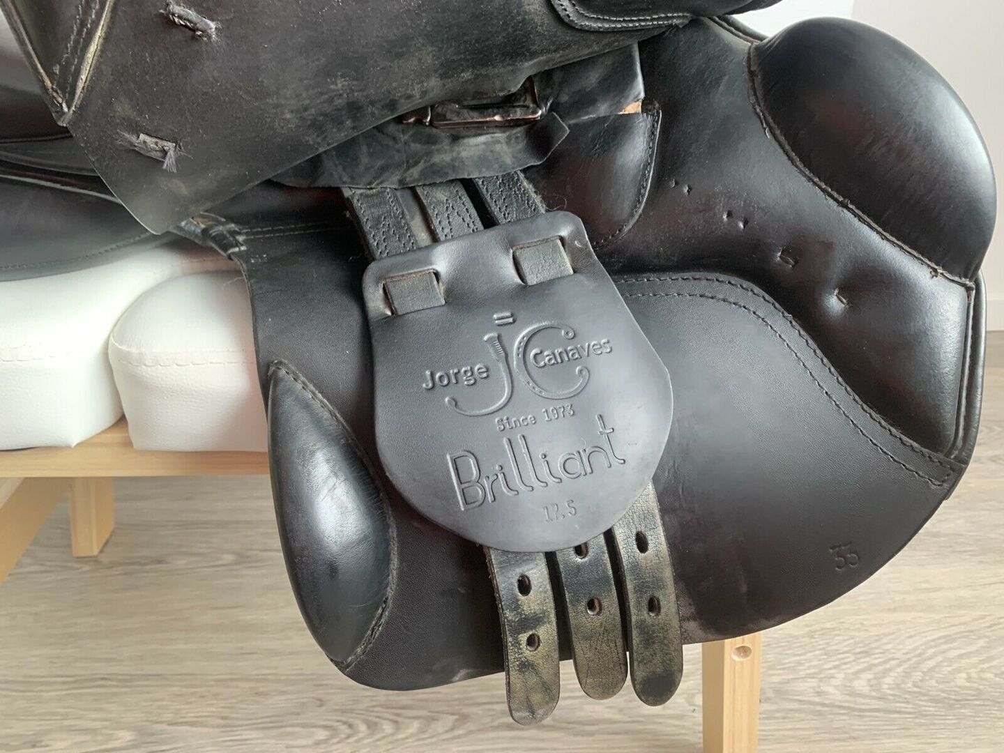 Springzadel Jorge Canaves 17,5" - Het zadel is zeer comfortabel en geeft veel steun door de grote pommels. Het leer is een beetje gebarsten op het zadel en in de knie- en kuitstreek, maar dat merk je niet tijdens het rijden en het wordt ook niet erger.