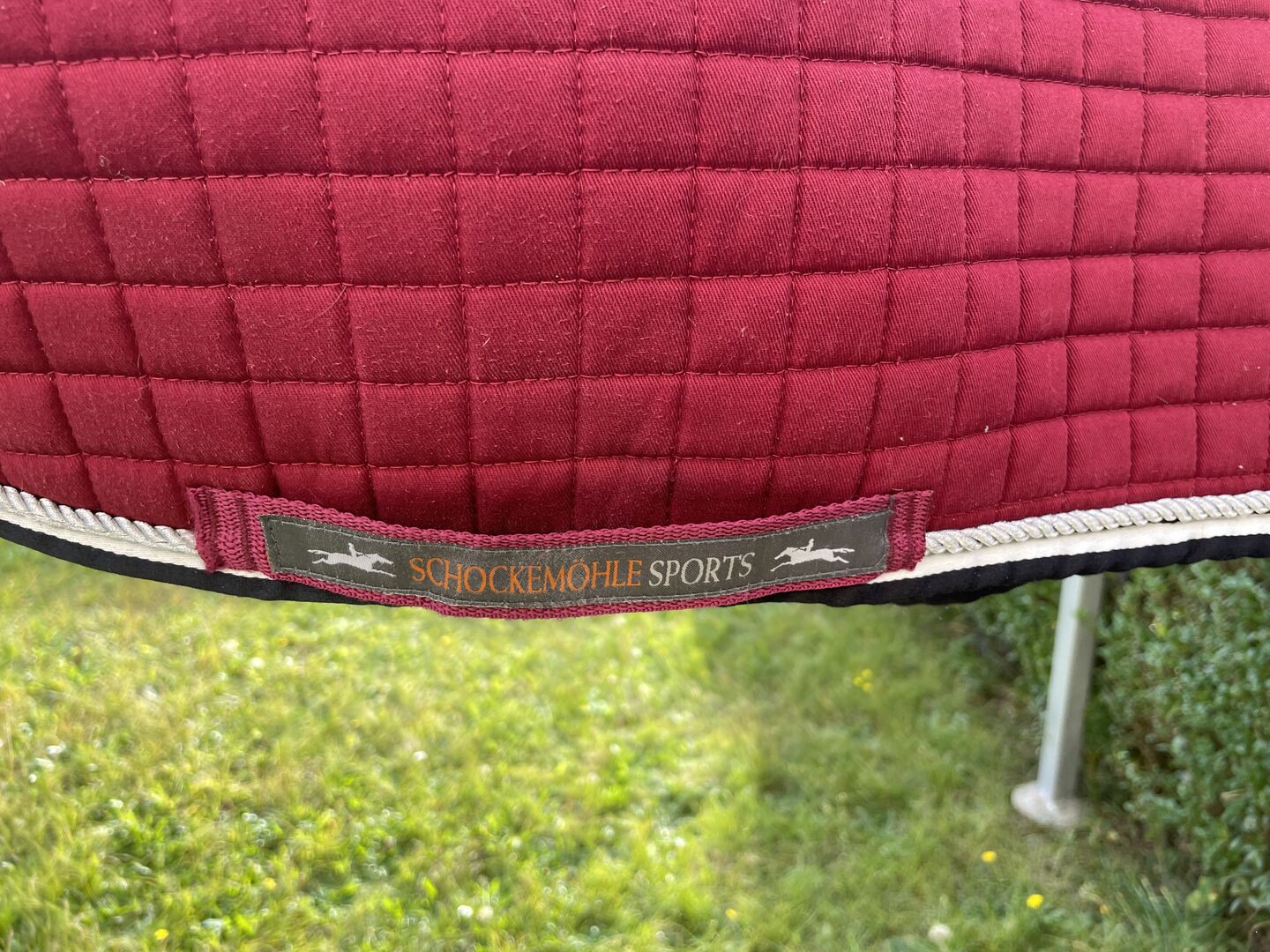 Springzadel Neostarpad Wijnrood van Schockemöhlesports - Atletisch zadeldek van Schockemöhlesports met twee gekleurde randen en een koord. Het zadeldek is gemaakt van katoen met een sneldrogende onderzijde, waardoor zweet direct wordt afgevoerd. Geschikt voor springzadels en met zadel- en singellussen.