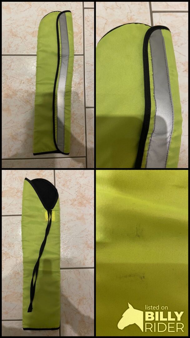 Staartbeschermingsreflector, waarschuwingskleur, reflecterend - Staartbeschermer voor grote paarden in de waarschuwingskleur geel met lange reflecterende strip voor goede zichtbaarheid, met extra koorden voor veilige bevestiging. Ideaal voor vervoer op de paardentrailer. Nooit gebruikt, slechts één keer gepast en op één plek een beetje vies geworden. Komt er veilig uit na het wassen!