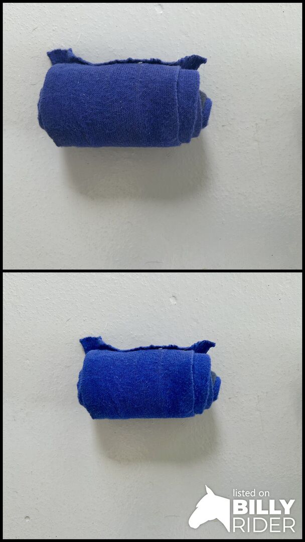 Standing or Stable Wraps Set of 4 Navy Like New Condition Width 12 cm or 4.5” Length 12 feet Double knit polyester with elastic “give” but not stretch, so that wraps cannot be bound too tightly -Royal Blue Colour