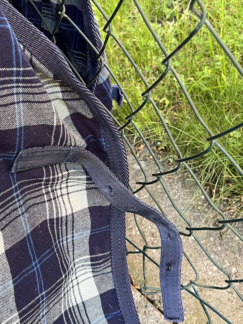 Stal vloerkleed blauw 145cm - Blauw geblokte staldeken, 145cm, helaas ontbreken 1 gesp en 1 touwtje aan de voorkant, kan kruislings gesloten worden, 1 buikband heeft draadjes loshangen en laat een beetje los, maar kan weer aan elkaar genaaid worden