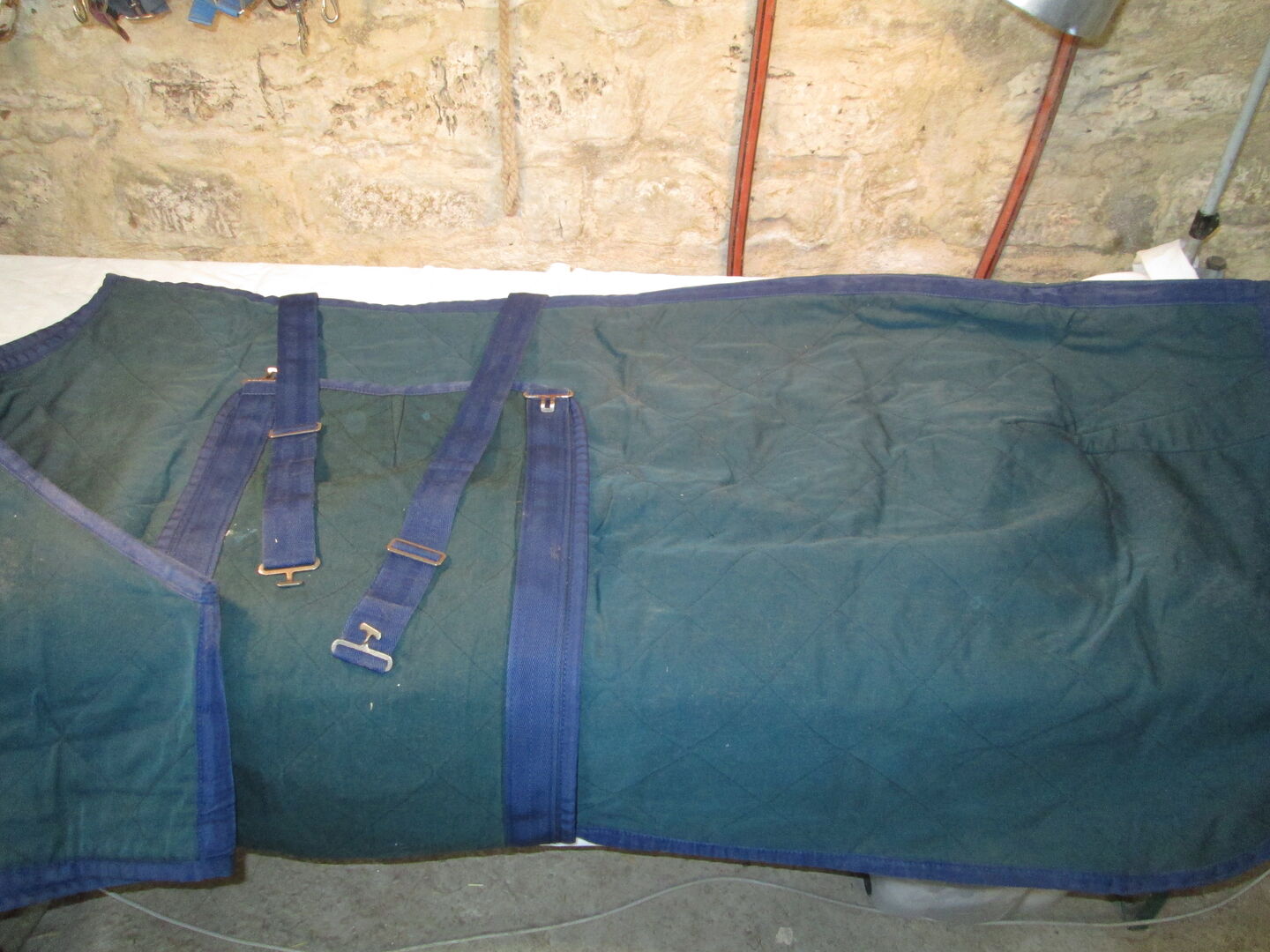 Staldeken 155 1,55 met buikdekenhoes - Te koop is een staldeken om in te glijden, dus aan de voorkant gesloten. Hij is 155 cm lang en heeft een buik slabbetje. Het is pas gewassen, maar heeft natuurlijk haren aan de binnenkant van het fleece vilt.