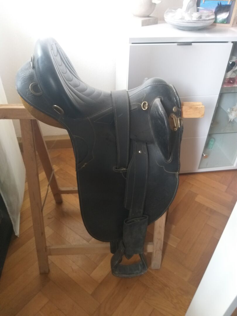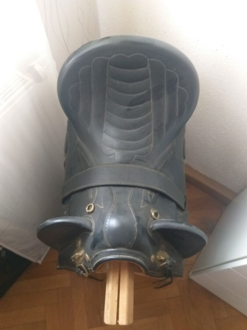 Standaard zadel zonder hoorn - Ik bied een zelden gebruikt stockzadel aan. Het werd gebruikt op een volbloed met hoge schoft en een tenger postuur. Het zadel is altijd goed onderhouden en is ongevalvrij. Hij heeft een slokdarmbreedte van 15 en een zitvlak van 16,5 inch. Verzending mogelijk tegen meerprijs.