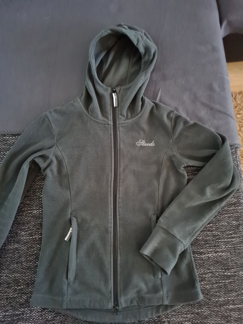 Steeds Fleece Jas S groen - Fleece jas Steeds Maat: S Kleur: groen, flessengroen Twee steekzakken met ritssluiting Twee-weg ritssluiting Kap Versleten maar in zeer goede staat.