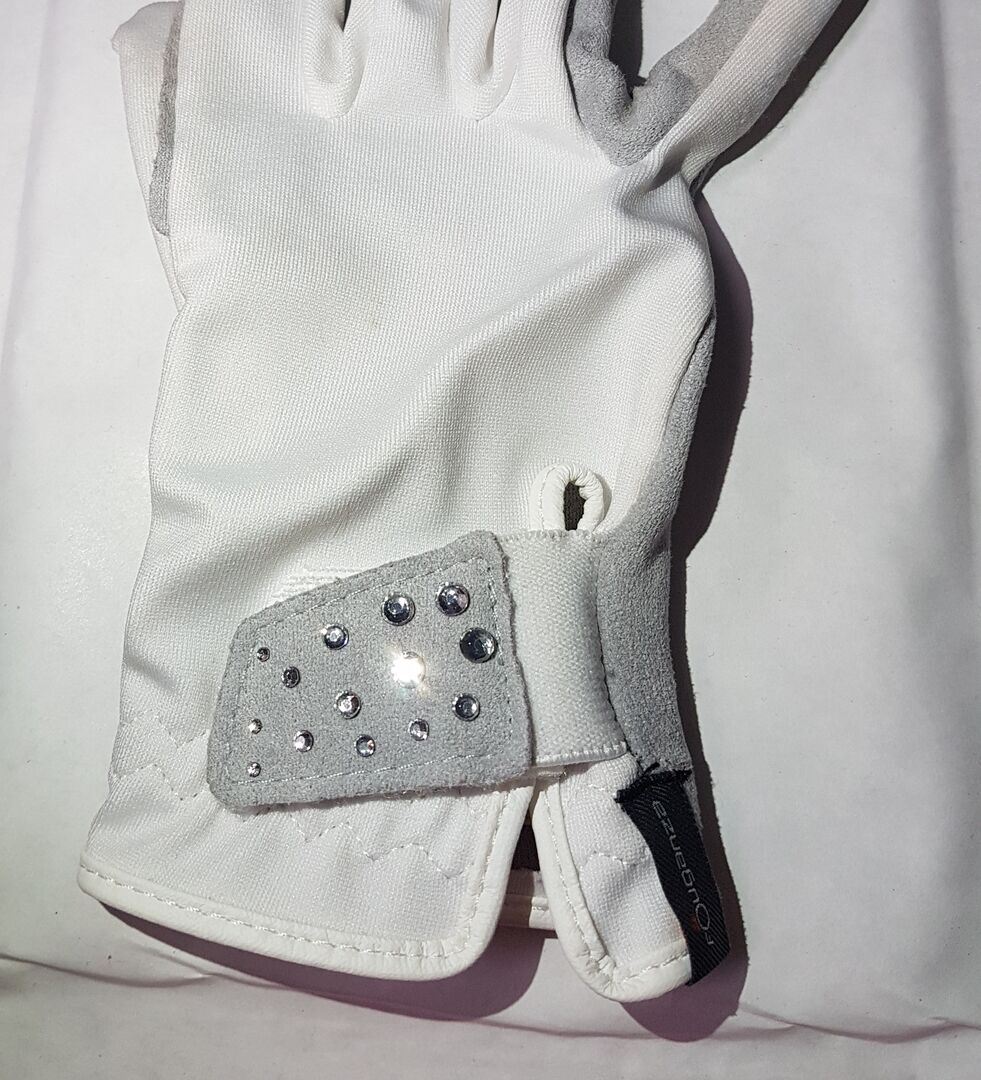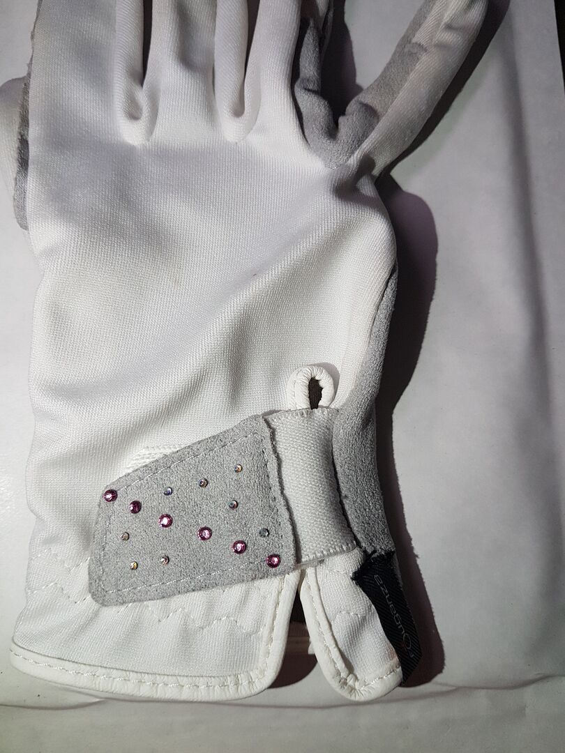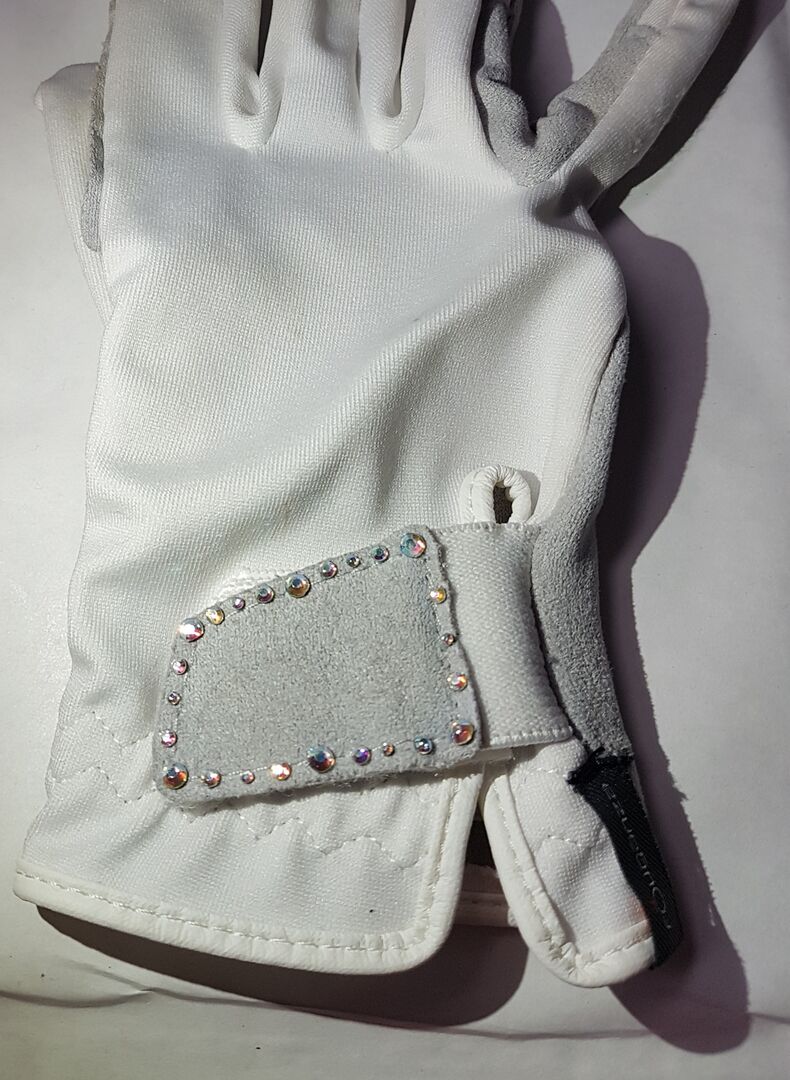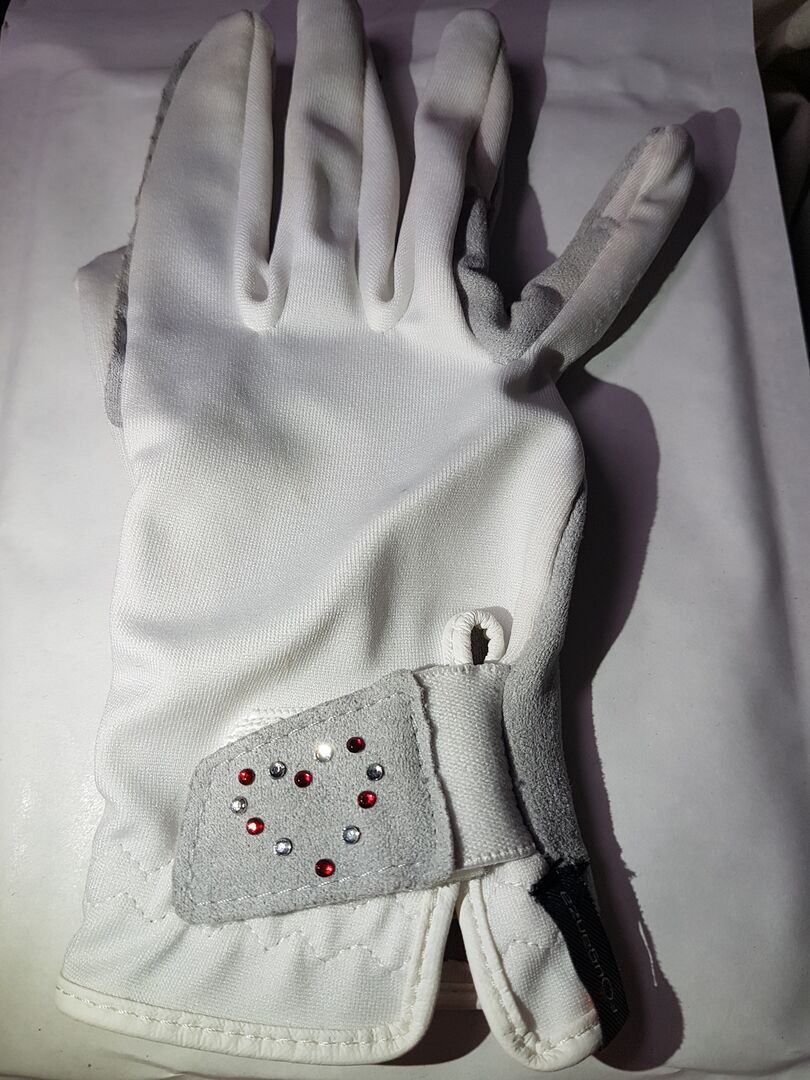 Stemhandschoenen met glitterstenen - Ik verkoop mijn stemhandschoenen maat S, die in zeer goede staat zijn. Ze hebben alleen een lichte verkleuring die nauwelijks zichtbaar is op 2 plaatsen. De klep wordt naar wens versierd met strass-steentjes. Kleur en variatie kunt u zelf kiezen. Een paar voorbeelden op de foto's, maar al het andere is mogelijk. Het kan ook glitter zijn in plaats van de band op de rug van de hand.