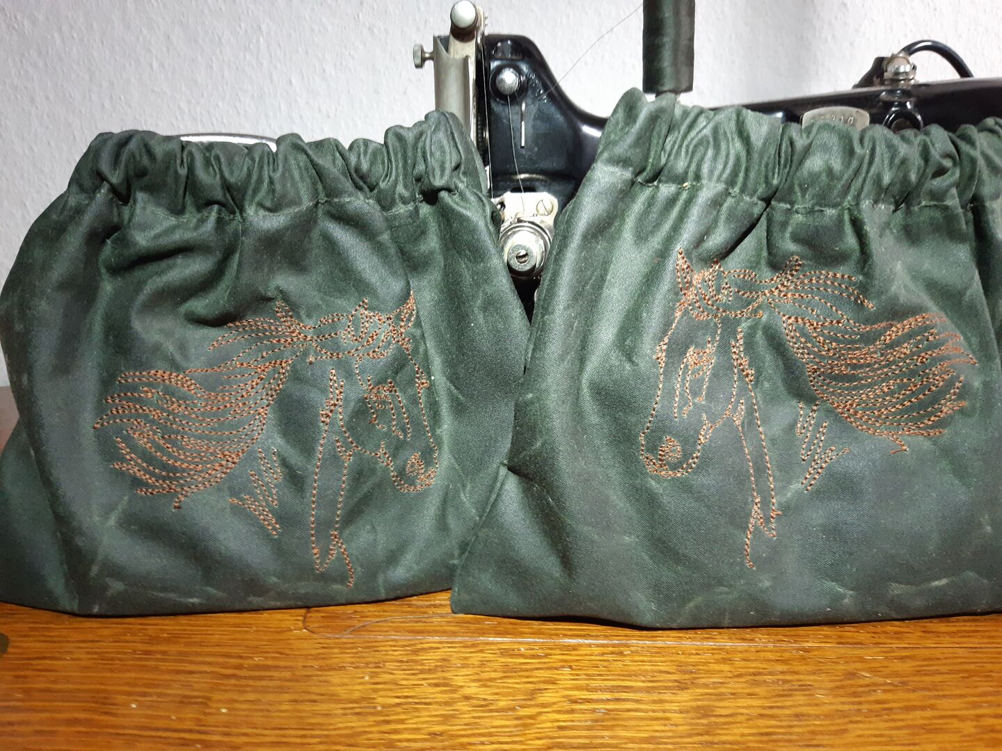 Stijgbeugelbeschermers Geborduurde oliehuid - Sokken voor je stijgbeugels ter bescherming en omdat ze er gewoonweg geweldig uitzien! De stijgbeugelsokken worden op hun plaats gehouden door een elastiek. Genaaid van robuuste en hoogwaardige oliehuid door Merchant and Mills uit Engeland en persoonlijk geborduurd. Oliehuid: Echt - de beste kwaliteit traditionele oliehuid, gemaakt in Engeland, leeftijdsbestendig en mooi om te dragen. De Oilskin heeft een stevig handvat. Dit heeft als voordeel dat de stof mooi verandert bij het hanteren en leeft bij het dragen - vintage look. De stof zal na verloop van tijd zachter worden. Beschikbare kleuren: Donkerbruin, donker olijf, zwart, mosgroen, donkerblauw, wijnrood. Voor speciale verzoeken kunt u mij schrijven. Mijn telefoonnummer is 0163-4908149