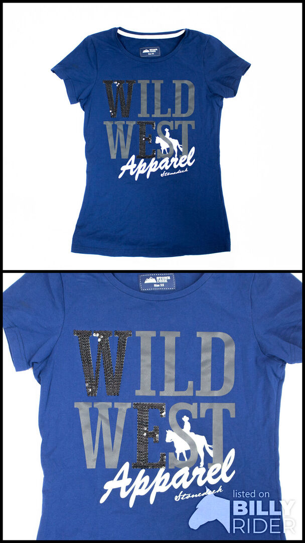 Stonedeek T-Shirt blauw XS - T-shirts van Stonedeek zijn perfect voor dagelijks gebruik in de stal. De top is maat XS en blauw. Het shirt heeft grote letters "Wild West Apparel" op de voorkant, die bedrukt en geborduurd zijn met pailletten. Het shirt is zo goed als nieuw. To the seller's offerlaunch