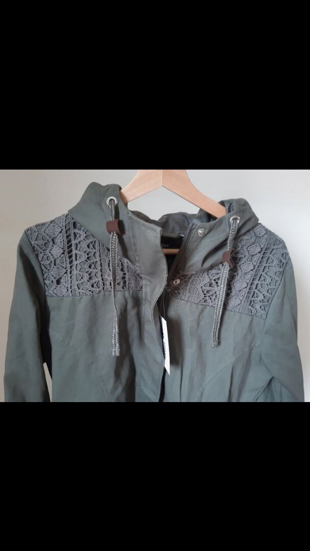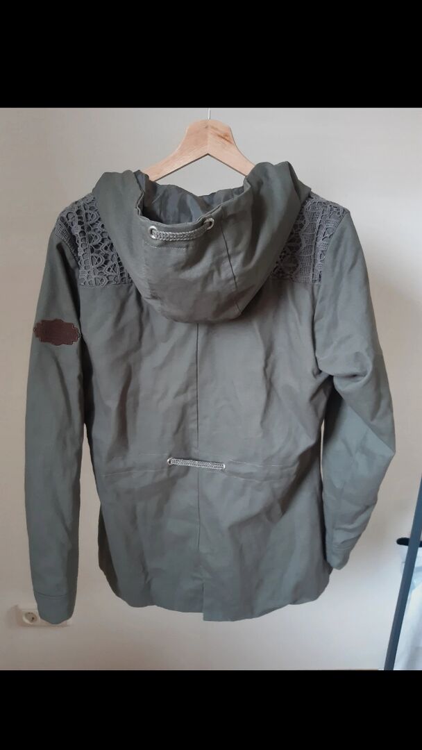 Stonedeek zomerparka Aina - Stonedeek zomerparka Aina Korte parka van stonedeek in fango (kaki), maat M (38). 100% katoen. Getailleerd model. Met capuchon en tunnelkoord in de taille. Ritszakken en ritssluiting aan de voorkant, elk verborgen met een knoopsluiting. Speels geperforeerd breipatroon op de schouders. Nieuw met label, niet meer verkrijgbaar bij Krämer in deze maat. NP 69