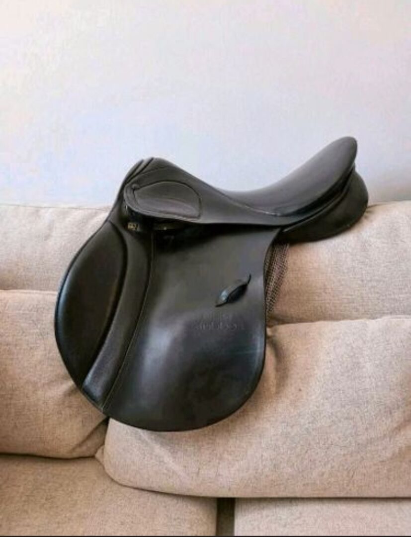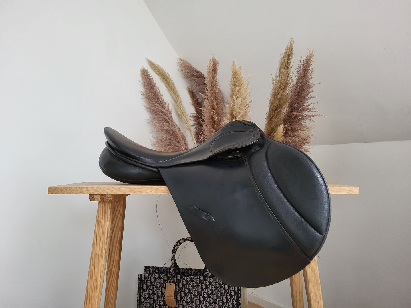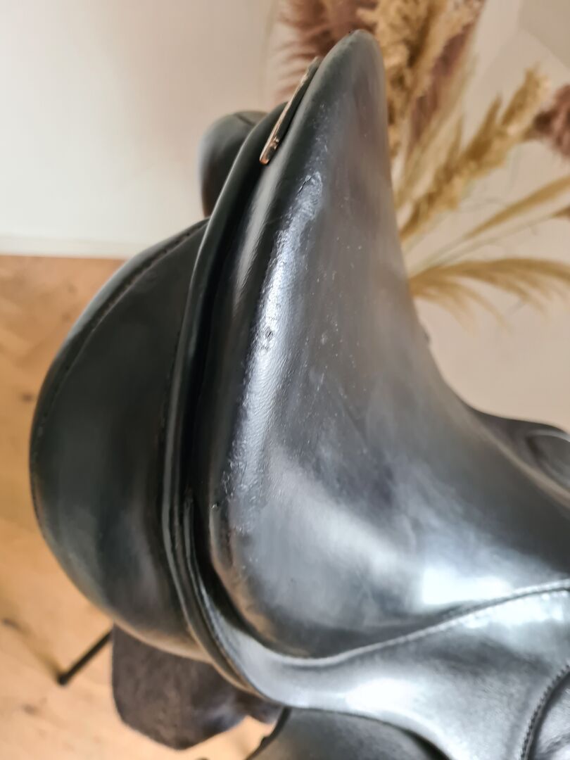17,5 zetel 32 kamer panelen met hoekprofielen breed zadel kanaal 4 singelbanden dikke pommels Op een paard met een hoge schoft.