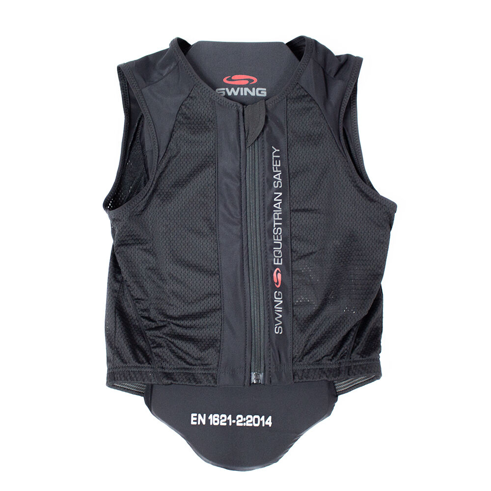 SWING rugbeschermer P06 flexibel Volwassene S - De rugbeschermers van SWING beschermen uw lichaam zonder het plezier van het rijden in gevaar te brengen. Het gebruik van hightech materialen zorgt voor maximale bewegingsvrijheid. De SWING Generation P06 rugbeschermer overtuigt door optimaal draagcomfort en maximale bescherming van de wervelkolom en het stuitbeen. Hij is CE-gecertificeerd (volgens de motornorm EN 1621-2:2014). Dankzij de flexibele voorkant past het zich perfect aan de vorm van het lichaam aan en is het bijzonder comfortabel, waardoor een grote mobiliteit mogelijk is. Merk op dat volgens de LPO een vest volgens EN 13158-2000 of EN 13158-2009 vereist is voor het rijden van eventing- en cross-countrywedstrijden. Het is maat S (volwassene) en daarom geschikt voor mensen met een lichaamslengte van ongeveer 141 cm tot 157 cm, de lengte van het bovenlichaam moet tussen 39,5 cm en 44 cm liggen. Het is in zeer goede staat.