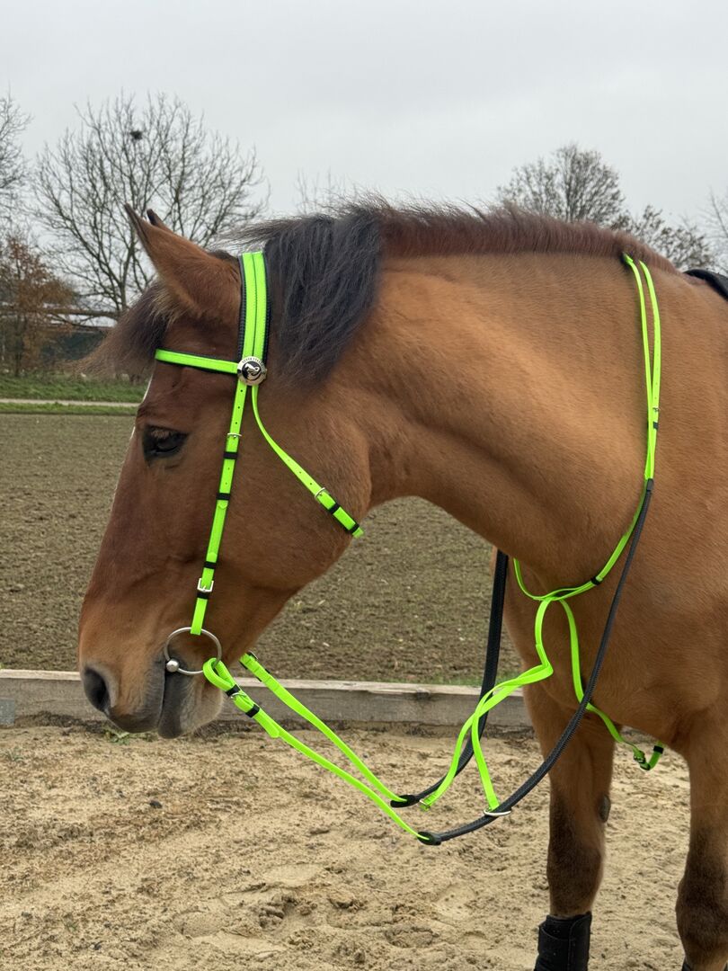 Synthetisch hoofdstel NEON GROEN glanzend met martingaal - Eersteklas synthetisch hoofdstel, glanzend neongroen met martingaal Glanzend Weerbestendig Met martingaal Inclusief teugels, gedeeltelijk met rubber bekleed Eersteklas synthetisch hoofdstel voor paarden, glanzend neongroen met martingaal, zonder neusriem, inclusief teugels. Dit hoofdstel is gedeeltelijk zacht gevoerd, zeer onderhoudsvriendelijk, weerbestendig en licht van gewicht. De teugels zijn gedeeltelijk met rubber bekleed. Een product van het merk Super Steeds.