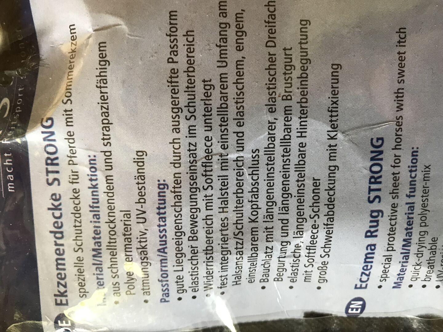 Te koop Busse eczeemdeken Strong in maat 135cm - Het eczeemdeken Strong in de maat 135cm en de kleur antraciet zit in de originele verpakking en is nieuw. Het is nog niet uitgepakt! Er zit alleen een klein scheurtje in de onderste rand van de verpakkingszak (zie foto). De deken is een speciale beschermende deken voor paarden met zoete jeuk. Het is gemaakt van sneldrogend en slijtvast polyester materiaal en is ademend en UV-bestendig. Helaas heb ik de deadline voor het retourneren van de deken gemist, daarom verkoop ik hem nu op deze manier.