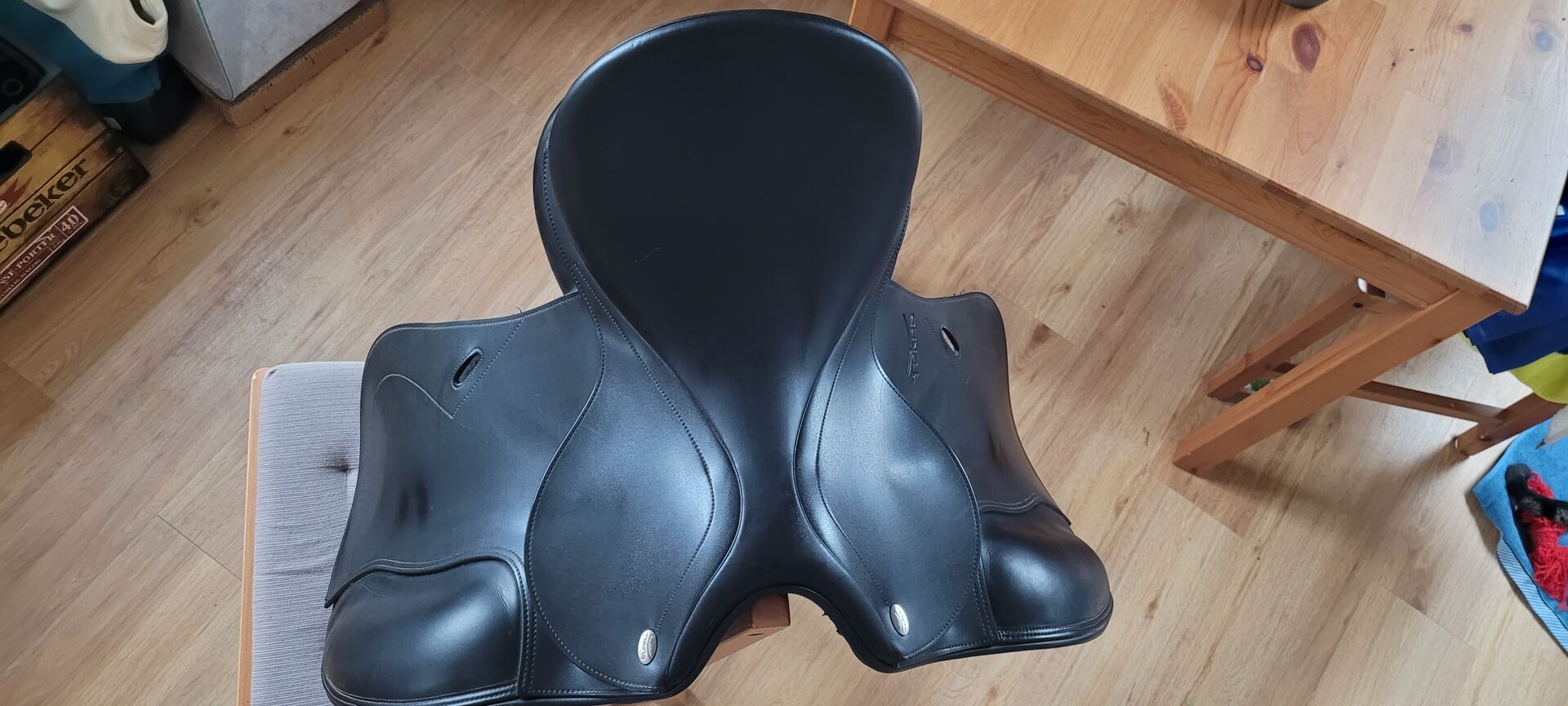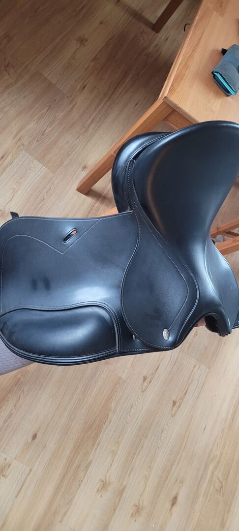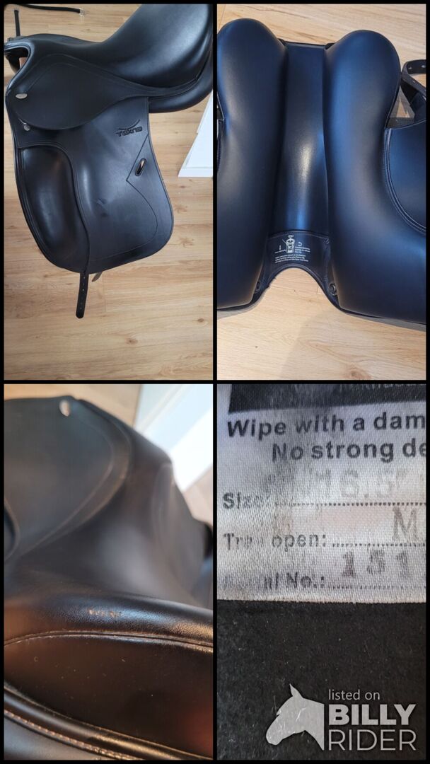 Tekna dressuurzadel 16,5 - Hallo, Ik verkoop mijn Tekna dressuurzadel 16.5. Het zadel lag op een bredere pony en heeft een kort contactoppervlak. Het heeft een MW-groefplaat. Er zijn kleine krasjes (zie foto).