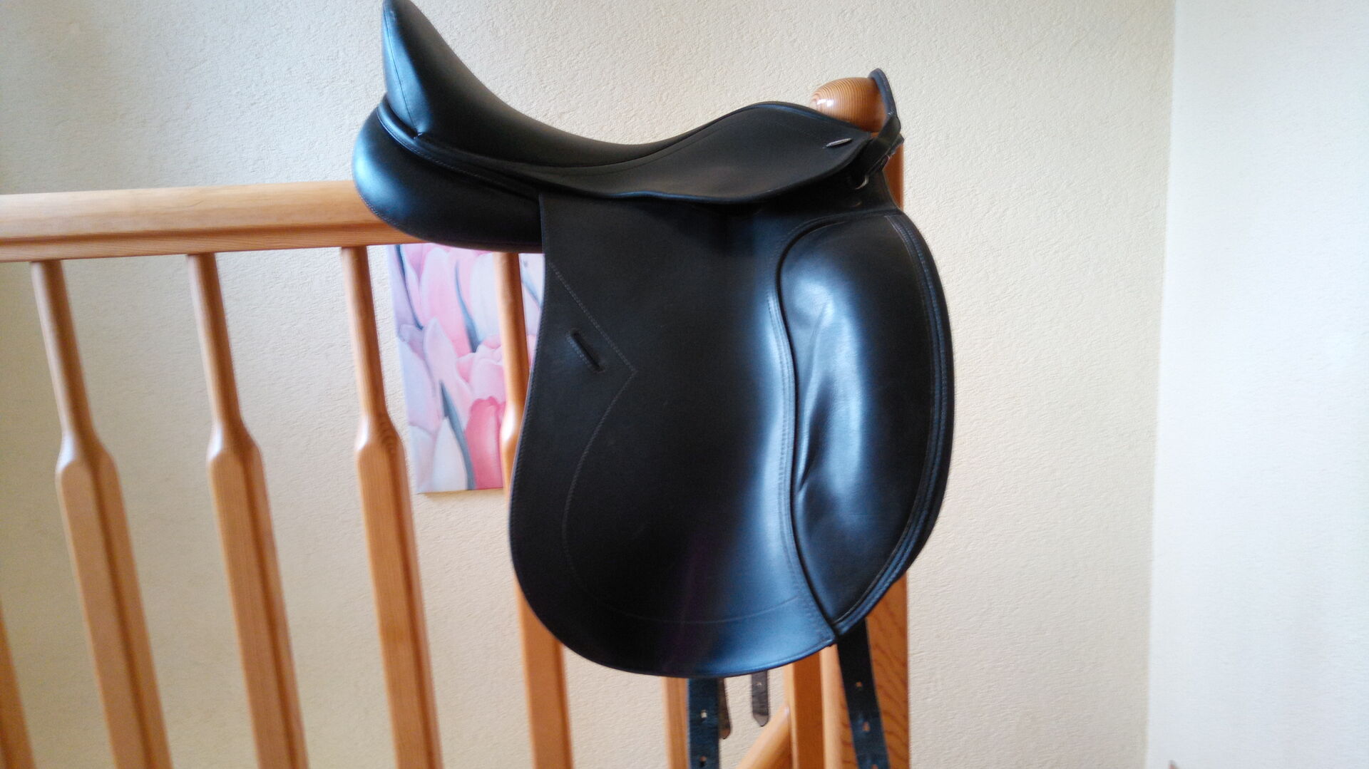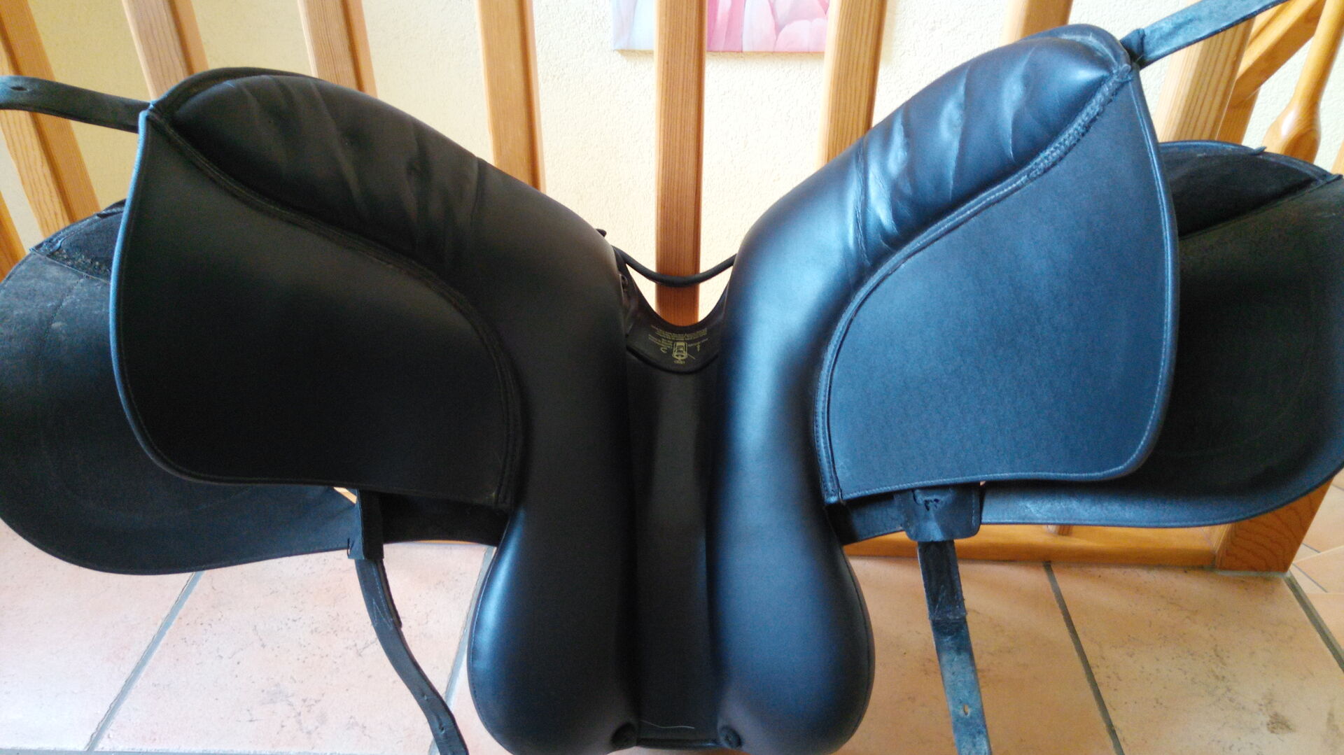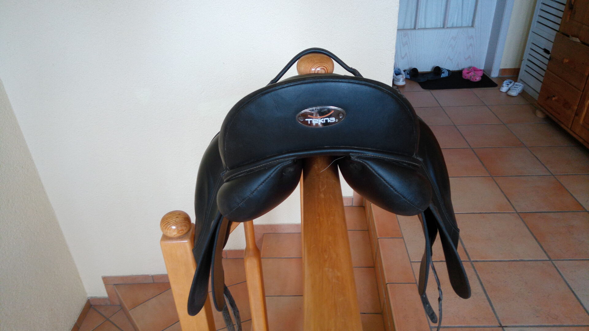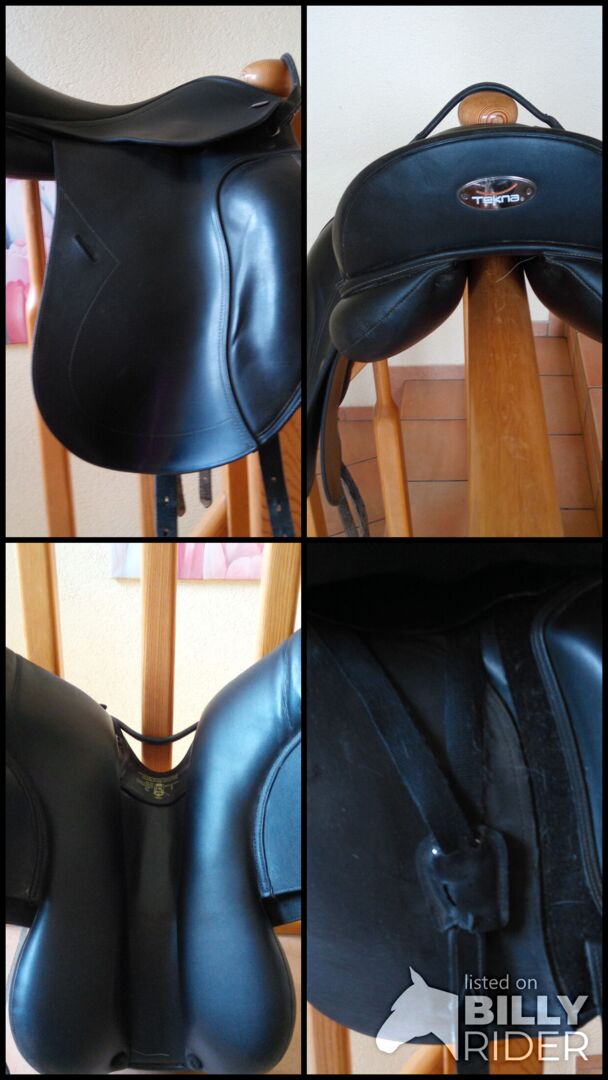 Tekna dressuurzadel 16,5" - Ik bied een Tekna dressuurzadel aan, laatst gebruikt door een kleine volwassene op een Duitse rijpony. Kleur zwart, waterafstotend en makkelijk schoon te maken dankzij het quick-clean oppervlak. Ik heb het zadel 2 jaar geleden samen met de pony gekocht, het is niet mogelijk om te zeggen hoe oud het zadel precies is. Vertoont lichte gebruikssporen, maar is net opnieuw gecontroleerd door de zadelmaker. De singelstoten zijn naar voren verplaatst voor de ronde buik van de pony. Inclusief klittenband. De stijgbeugelriemen worden boven de zadelklep geleid.