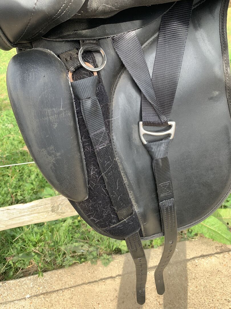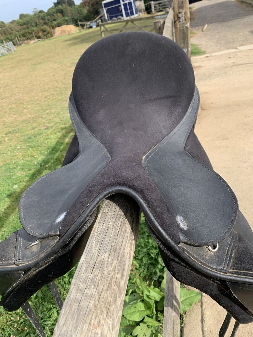 Lovely dressage saddle, synthetic , so very easy to wipe clean. Adjustable gullet so suits many horses, currently worn by an Irish sports horse.