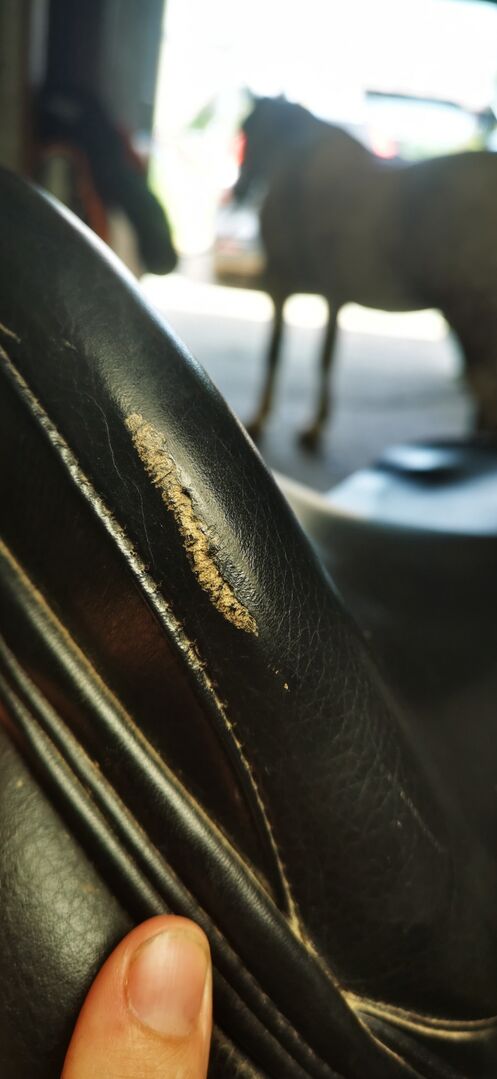 Condition: Very good condition. Light wear and a small scuff on the cantle. The stitching has come loose on the left flap.