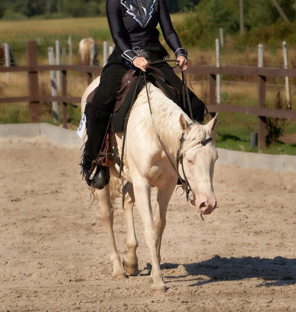 Toegewijde Quarter Horse Mix merrie in ongewone kleur - Deze blikvanger in de geweldige kleur Perlino met grijze ogen zoekt een 5-sterren thuis. De merrie is geboren in 2016 en is 146 cm groot. De merrie heeft een correct exterieur en is goed bespierd. Geen gewichtdrager. Rain staat momenteel in een open stal, maar is ook bekend met boxstalling. Ze heeft 2 jaar geleden een patella luxatie gehad, die behandeld is in een kliniek. Met voldoende training geeft dit echter geen problemen meer. Rain is een toegewijde en gevoelige merrie. Ze probeert het haar ruiter altijd naar de zin te maken, maar raakt overbelast als er te veel druk wordt uitgeoefend. Ze heeft daarom een ruiter nodig die haar de nodige rust en veiligheid geeft. Ze heeft een solide basis western training en is de afgelopen 2 jaar geshowd in ranch riding, ranch rail en trail op de EWU. Daar heeft ze talrijke klasseringen mee naar huis kunnen nemen. Ze is ook bekend met cross-country rijden. Ze rijdt ook alleen, maar gaat het liefst crossen met een veilig paard. Rain is geen slaappil. Ze is vertrouwd met honden, kinderen en andere landbouwmachines en heeft daar geen problemen mee. Ze is cool op shows en doet het geweldig. De merrie zou een geweldige partner zijn voor een rustige, ervaren ruiter die veel tijd met haar wil doorbrengen. Op wedstrijden of als vrijetijdsgezel. Particulier te koop. Plaats: 49661 Cloppenburg