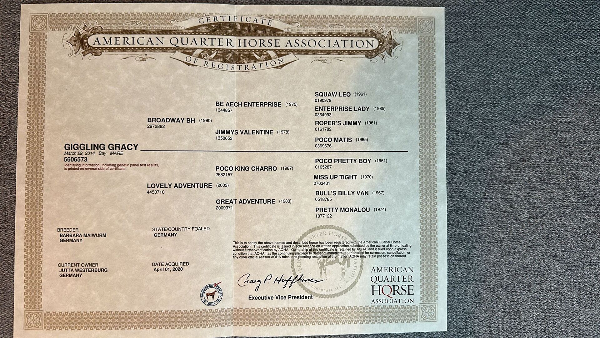 Top getrainde Quarter Horse merrie - Plaats: 29690 Grethem Giggling Gracy - fijn getrainde Quarter Horse merrie, geboren in 2014 met een stokmaat van 150 cm, is op zoek naar een nieuw 5-sterren thuis wegens inkrimping van de kudde. Grace is een hele lieve, eerlijke en meewerkende merrie die veel plezier heeft in de omgang en om te rijden. Ze is erg mensgericht maar ook gevoelig. Grace staat momenteel in een paddock box, maar is ook bekend met weiden en hoeden. Ze is gezond, recente röntgenfoto's zijn beschikbaar zonder bevindingen. De merrie heeft een zeer goede westerntraining in de richting allround en is klaar om te showen. Ze heeft 6 jaar showervaring en is succesvol uitgebracht, vooral in trail- en ranchrijden. Grace heeft veel cursussen gevolgd met haar eigenaar en gaat ook off-road. De merrie heeft een zeer goede, oude reining/allround afstamming. Haar vader is Broadway BH. Een topvererver die veel invloed heeft gehad op de reiningwereld. Haar moeder heeft Poco Pretty Boy en Bulls Billy Van op haar pedigree. Als je op zoek bent naar een top getraind senior paard, dan is Grace echt iets voor jou.