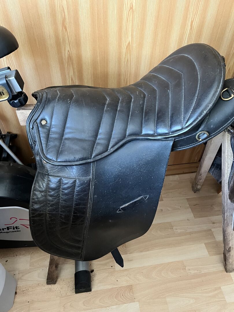 Leer, compleet met stijgbeugels en singel in goede gebruikte staat.