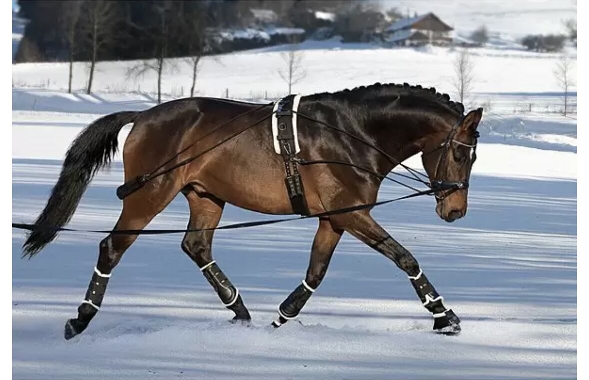 Trainingsharnas - Bij het longeren worden de achterhand en de rug vaak verwaarloosd, omdat de meeste hulpteugels alleen vóór het tuig hun effect laten zien. Hier wordt de achterhand actief bij de training betrokken. Bovendien wordt een voorwaartse neerwaartse strekking mogelijk gemaakt. Aanpasbaar. Zonder longeerriem, zonder longe.