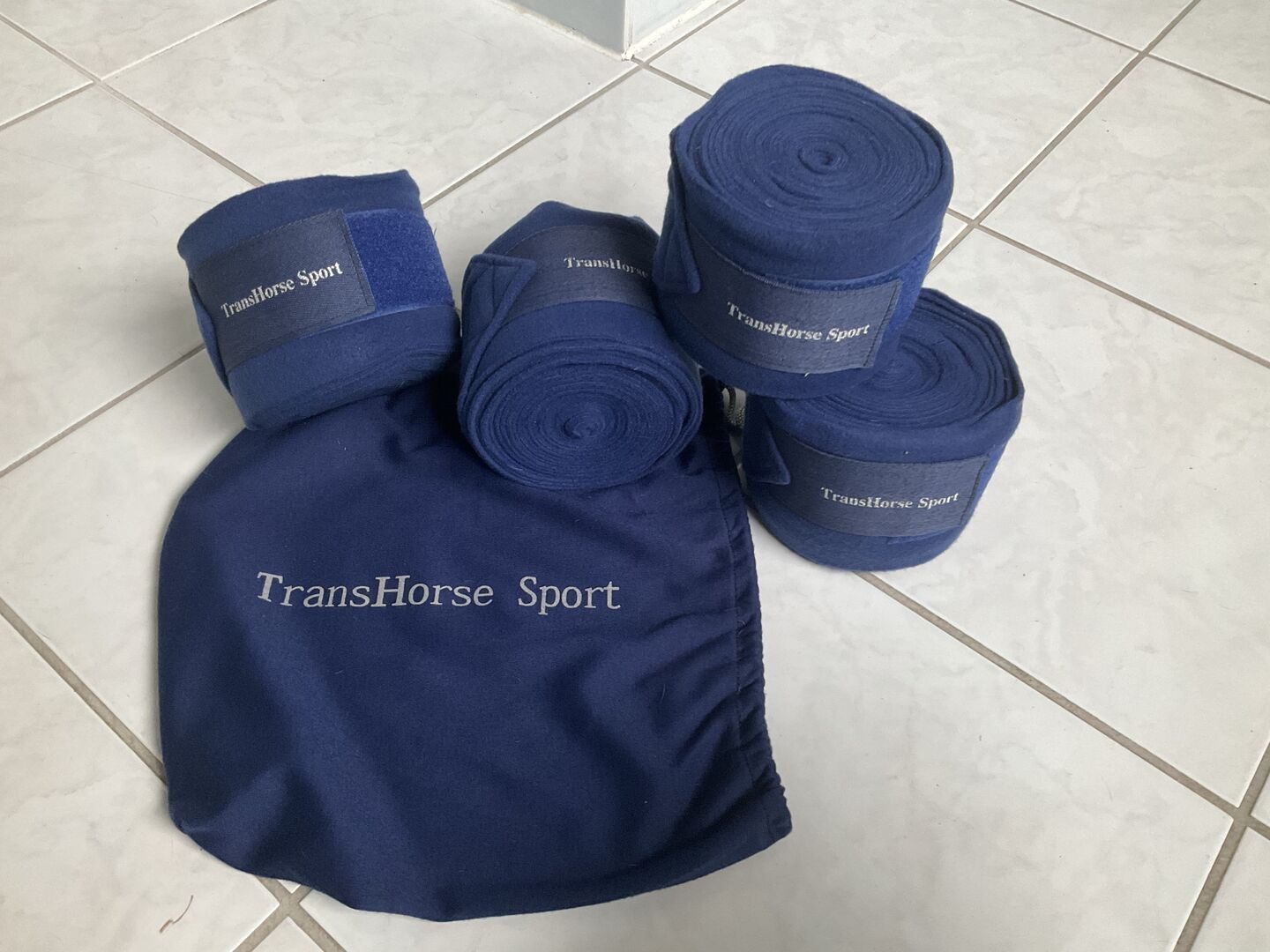 TransHorse 4 blauwe bandages, topconditie - Ik verkoop 4 prachtige donkerblauwe bandages van het populaire merk TransHorse inclusief tasje. Ze zijn in topconditie en bijna nooit gebruikt omdat ik liever gaiters gebruik.