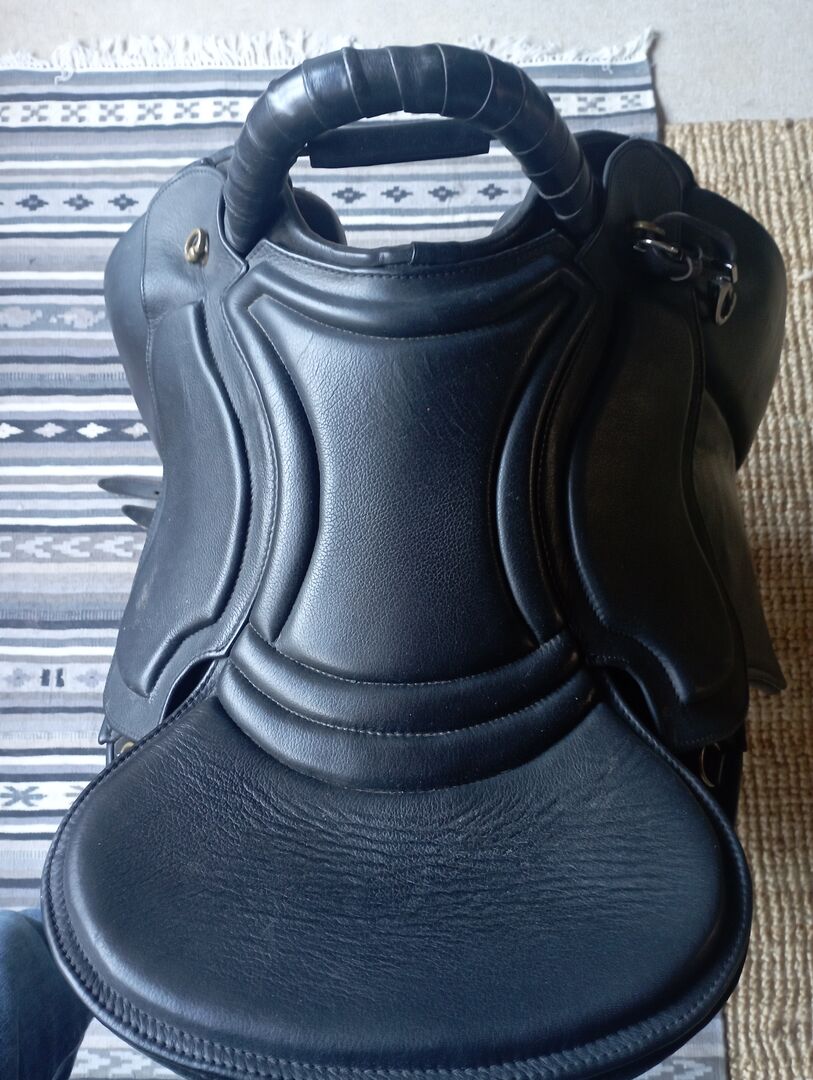 Trekkerzadel, boomloos verstelbaar - Zeer comfortabel zadel, boomloos, in alle richtingen verstelbaar. Zitmaat, kamerbreedte, gemakkelijk aan te passen, dus geschikt voor bijna alle paarden en ruiters. De klittenbandpanelen zijn erg dik, geweldige vulling voor je paard. Geen speciale onderlegger of zadeldek nodig. Het zadel is lekker licht en kort (50 cm). Dit is ook variabel dankzij de klittenbandpanelen. Kijk anders eens op de "Trekker" website. Het is niet het nieuwste model. Ik heb het zadel zelf tweedehands gekocht. Slechts een paar keer gebruikt. De vorige eigenaars hadden het langer. De exacte leeftijd weet ik niet. Maar het zadel is in topconditie! Vraag gerust anders. Geen retourzendingen, want particuliere verkoop. Met vriendelijke groet, Dinah
