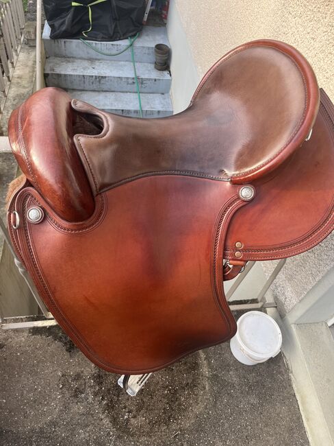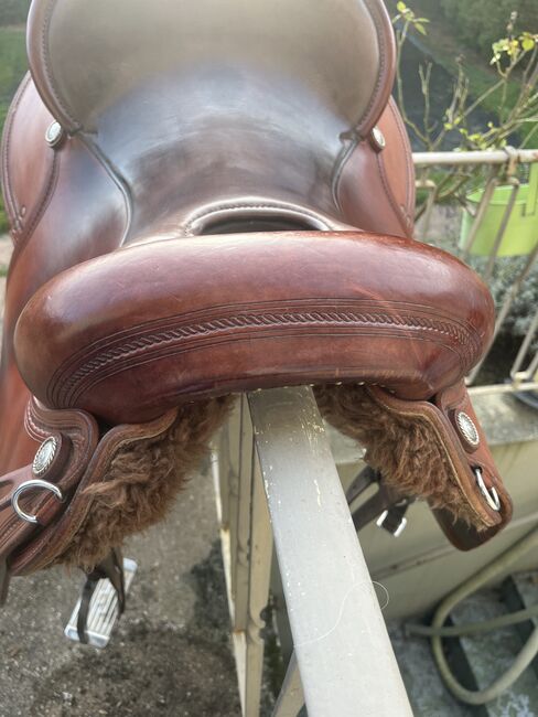 Uniek: Barok zadel met western zadeldek - Prachtig vrijetijds / barok zadel, gemaakt door zadelmakerij Schoch in Asbach op verzoek van de klant. Dressuurzadel met lange zadelklep. Ronde rok met schapenvacht. Lengte 63 cm. Flexibele zadelboom met lichte welving. Medium vork, geen hoorn.