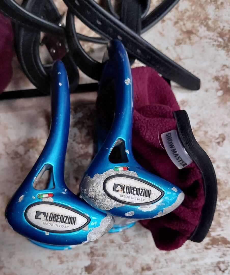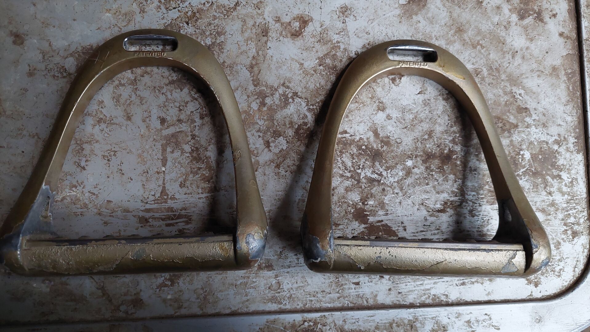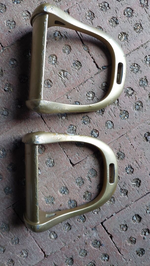 Verkoop 3 paar Lorenzini stijgbeugels - Verkoop 3 paar stijgbeugels van Lorenzini, 2x goud, zijn opnieuw gespoten. Maar is helaas weer gedeeltelijk afgebladderd. Evenals blauwe, ook afgebladderd.