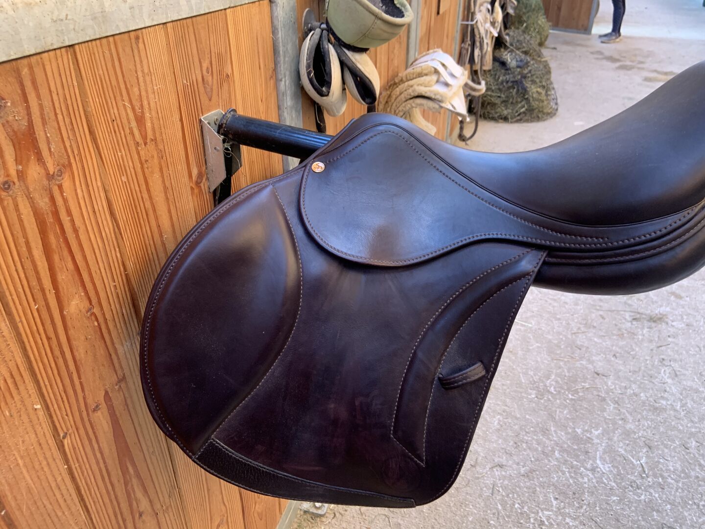 Verkoop Springzadel Selleria Italiana - Verkoop 1 jaar oud bruin springzadel 17,5 cm. Past bij een paard met een schommel in de rug en veel wreef. Heeft normale gebruikssporen. Verkoop omdat ik overschakel naar dressuur.