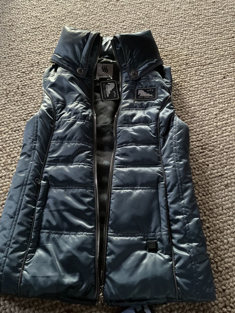 Verwarmd rijjasje van Equity vadis - Verwarmbaar ruitergilet van Equo Vadis in metallic ijsblauw. Het gilet kan in drie fasen worden verwarmd door een powerbank - natuurlijk kun je het chique gilet ook zonder verwarmingsfunctie gebruiken. Zeker nu kantoren niet zo verwarmd zijn. Levering zonder powerbank Oorspronkelijke prijs: 150 Euro Helaas de verkeerde maat gekocht. Foto's volgen