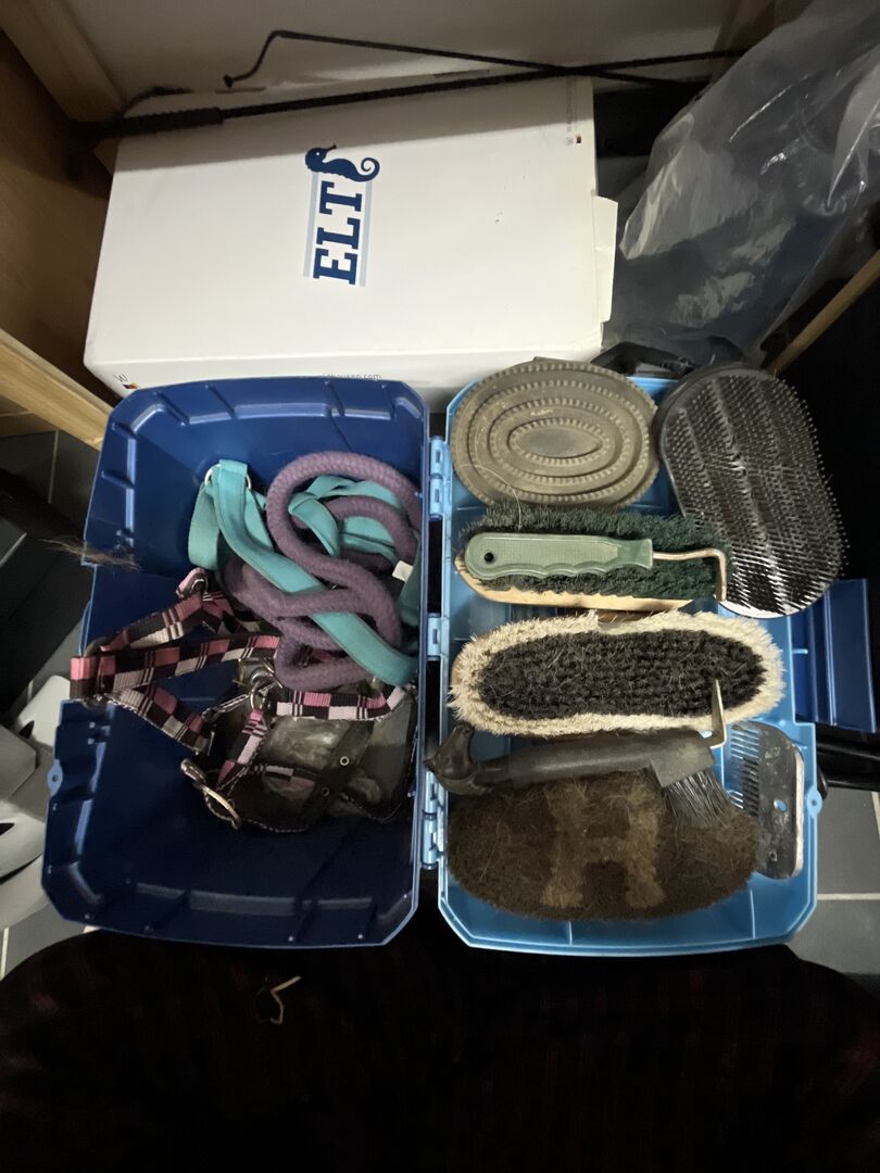 Keine Sachhaftung. Blaue Box, auch zum Draufstellen für das Pflegen große Pferde. Auch einzeln kaufbar. Box+herausnehmbares Fach siehe Bild+Putzsachen OHNE HALFTER UND STRICK OHNE HANDSCHUHE!!! Nur Putzsachen.