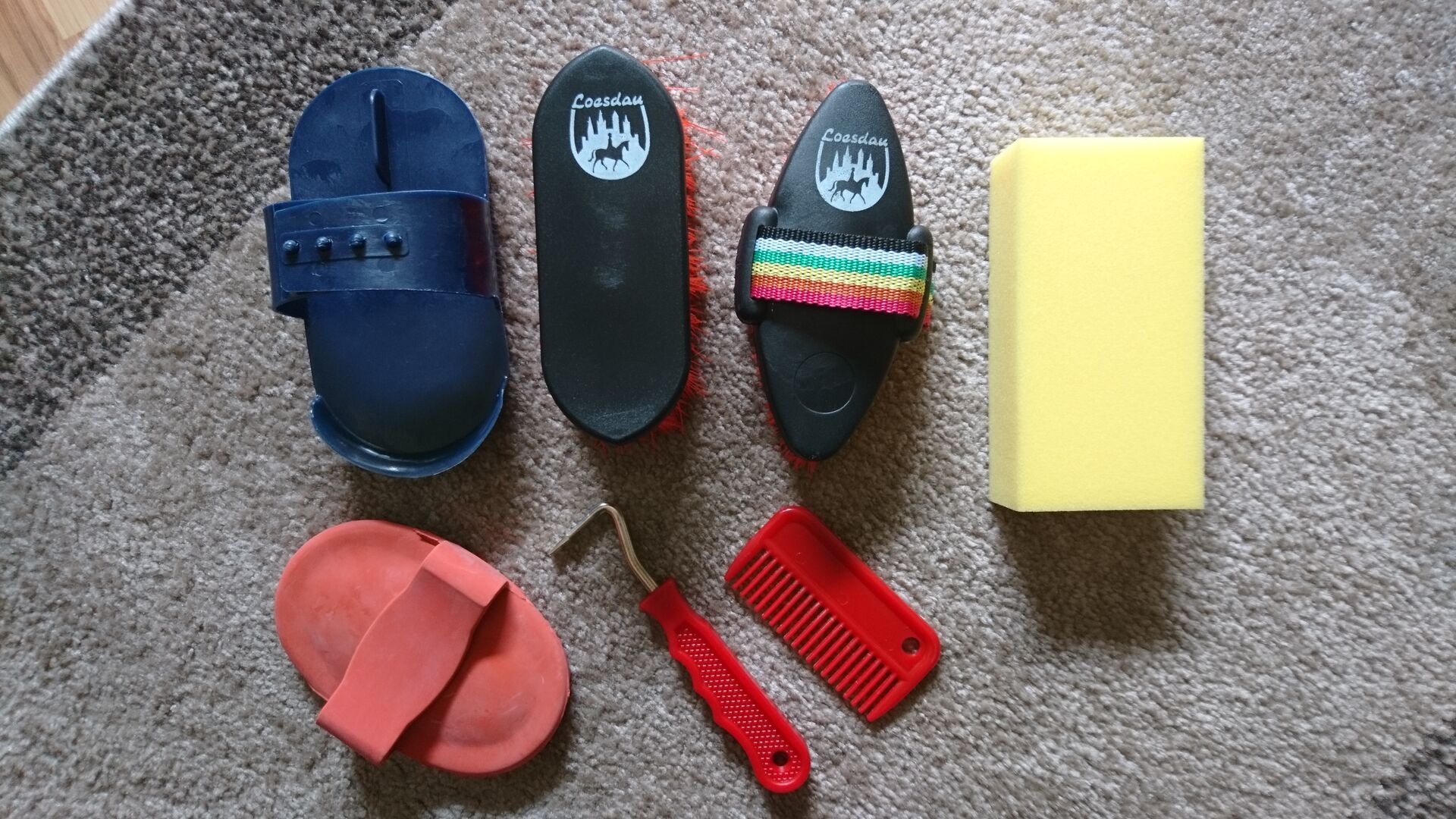 Verzorgingsset: Hoefkrabber klein, nieuw Manenkam klein, nieuw Rubber stoeprand rood klein, nieuw Kaart borstel van Loesdau, als nieuw Wortelborstel of manenborstel Loesdau, nieuw Massage krullenkam met fijne nopjes marine, nieuw Spons, nieuw Zakje kruidentraktaties