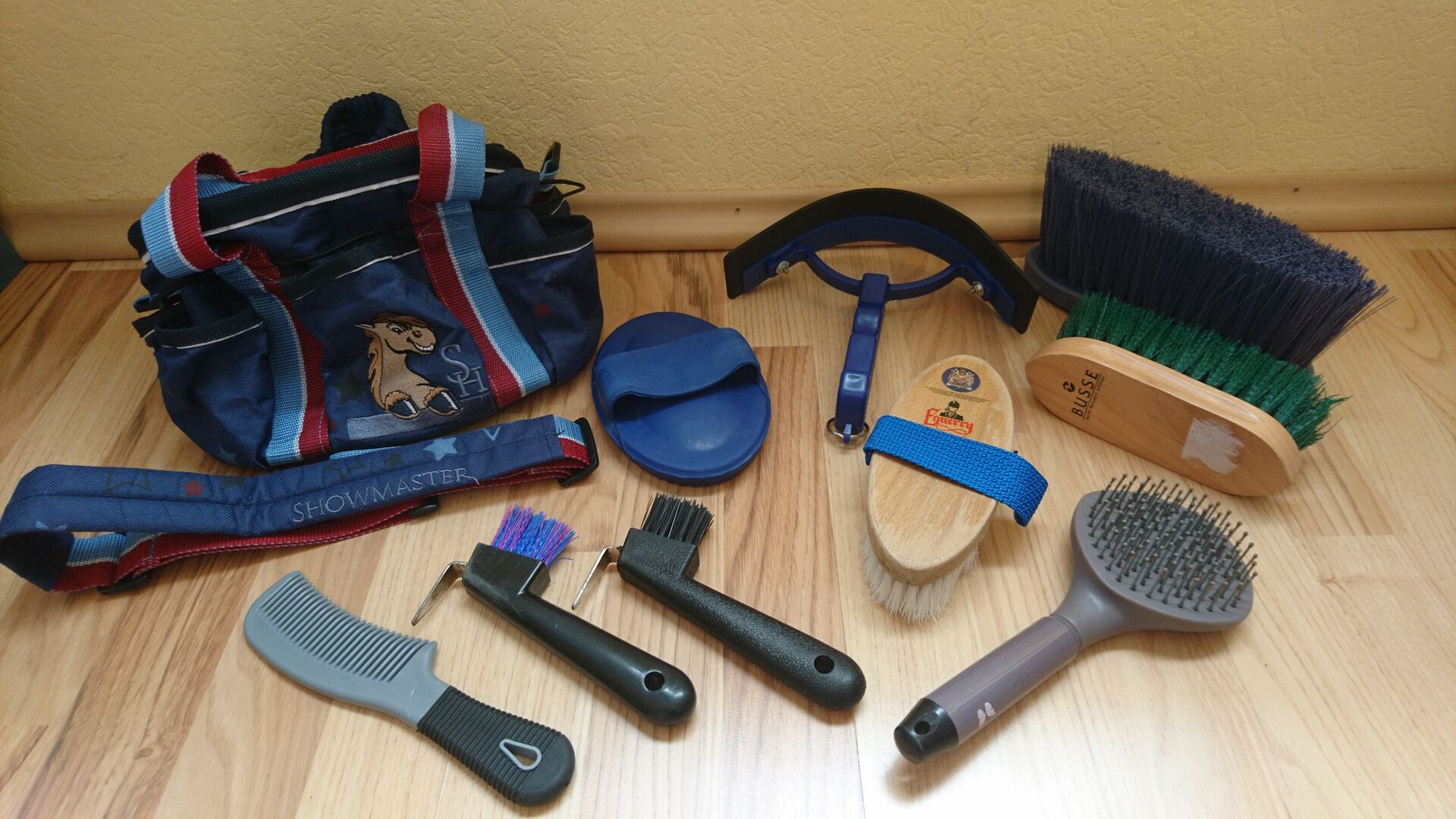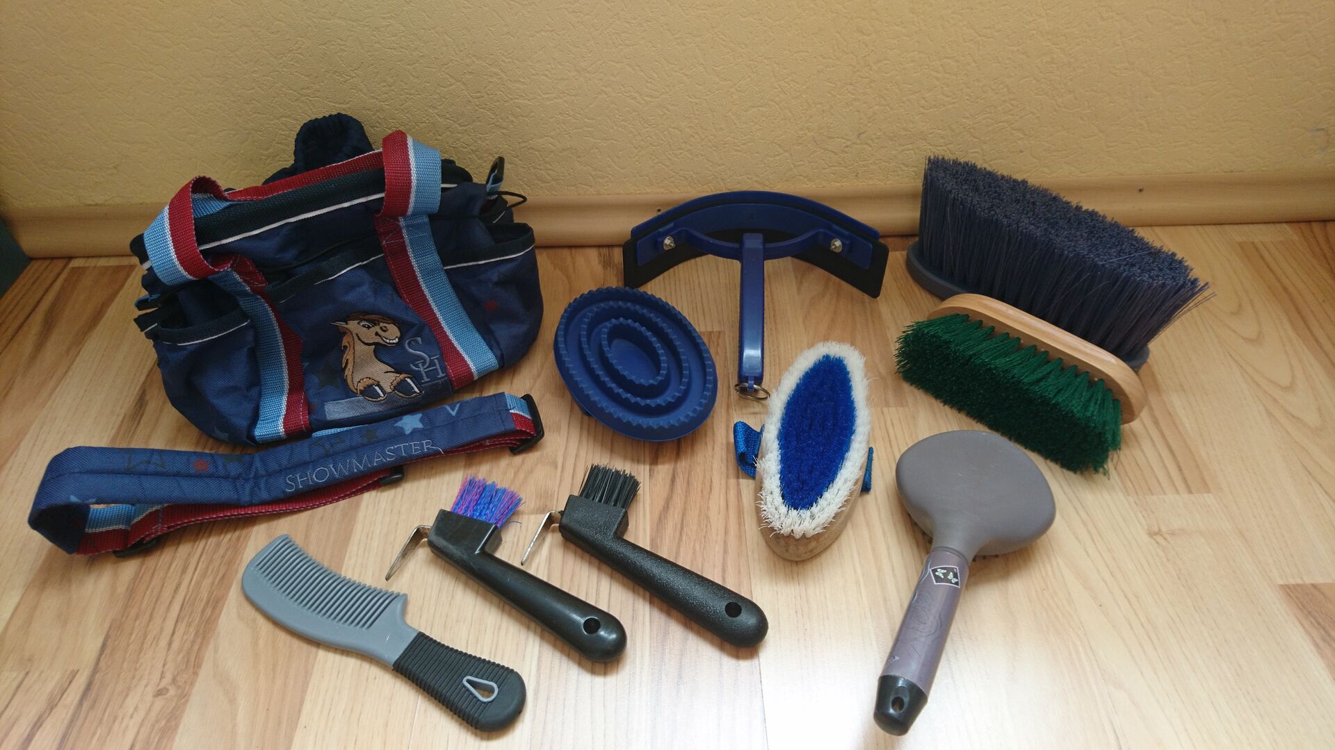 Verzorgingsset met kleine verzorgingstas - Aangezien we om gezondheidsredenen onze hobby hebben moeten opgeven, hebben we hier nog een kleine schoonmaakkit liggen. We zouden het graag als een complete set aanbieden. Inbegrepen in de set zijn: Showmaster lasmes, blauw, nieuw Busse wortelborstel, nieuw Borstel met lange haren, blauw Rubberopstand, groot, blauw Kaart borstel Manenkam Manenborstel 2x hoefkrabber met borstel