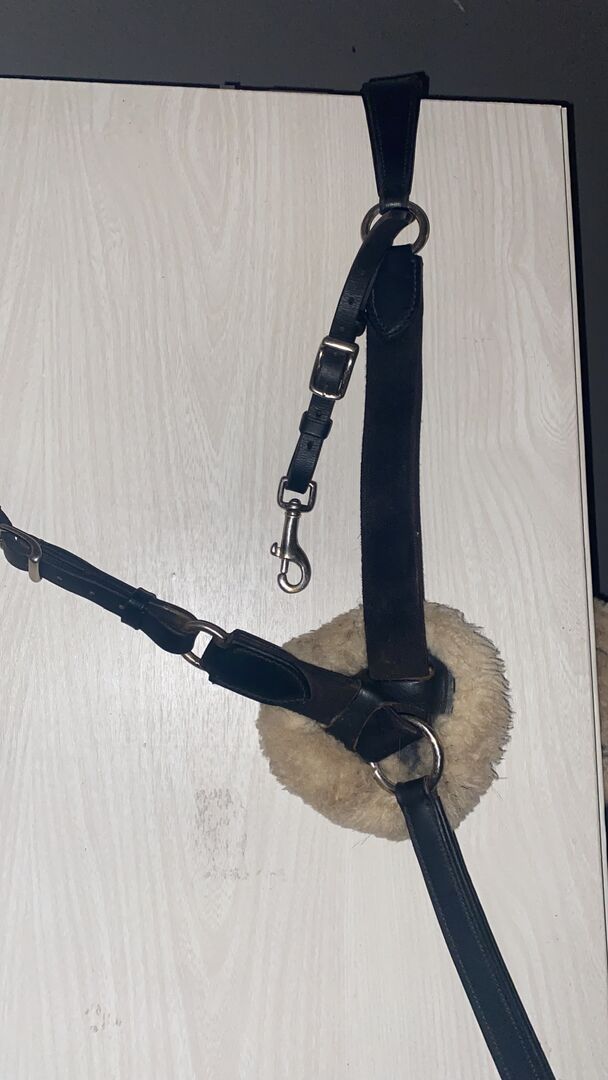 Vijfpuntig borstschild warmbloed zwart - Te koop is een goed onderhouden 5-punts borsttuig in de kleur zwart en in de maat warmbloed. Alle gespen en haken zijn volledig functioneel. Het leer is niet gescheurd en is goed onderhouden met leerreiniger, leervet en leerolie. Ik verkoop het borsttuig omdat ik een nieuwe wil kopen.