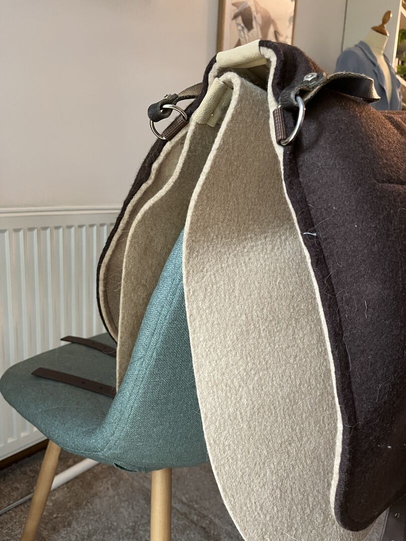 Vilten zadel - Verkoop vilten zadel van Isabell Steiner model Skuggi voor een platte schoft (Saffa) in donkerbruin met bijpassend vilten zadeldek in beige. Het zadel is als nieuw op een paar hardnekkige paardenharen na en wordt alleen verkocht omdat mijn paard zich helaas prettiger voelt met andere zadeldekjes.