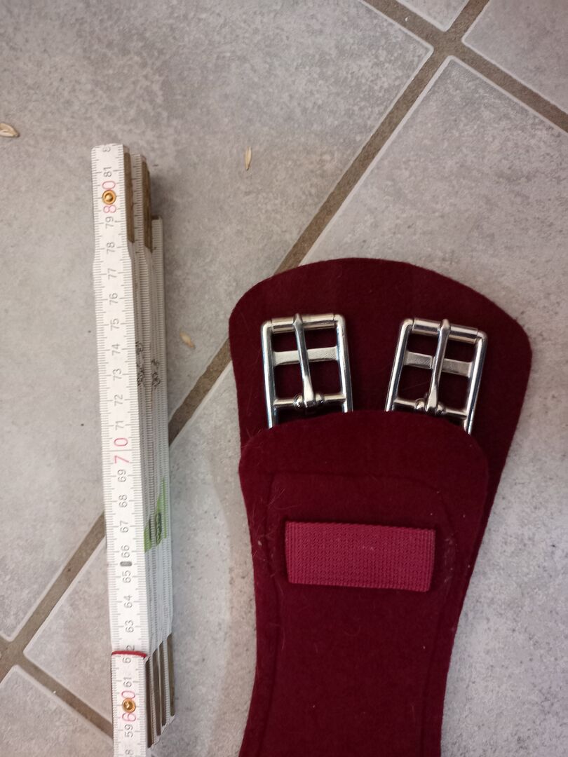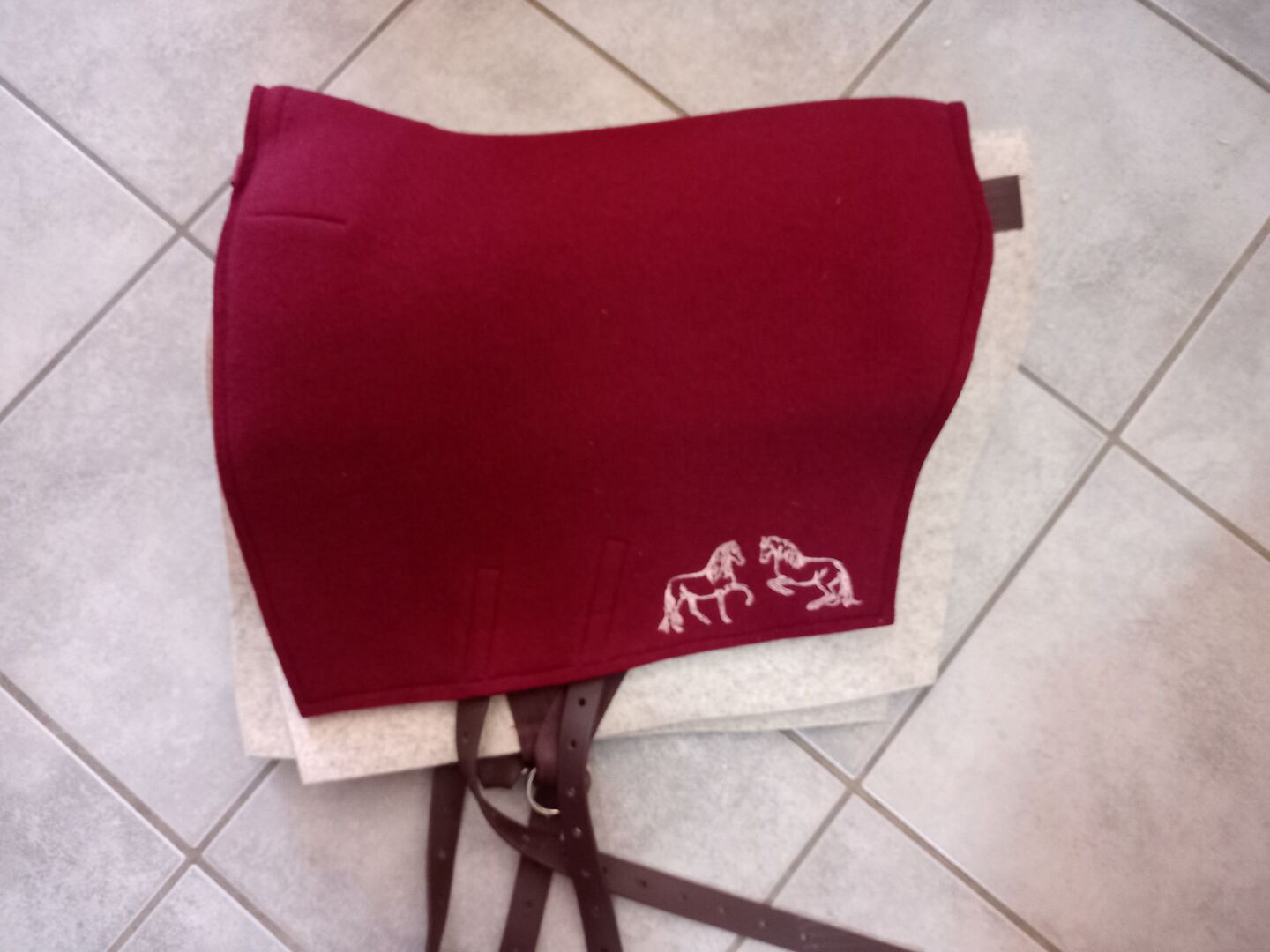 Vilten zadel door Isabel Steiner - Standaard vilten zadel, L'Amour uitvoering (met hoge schoft). Kleur wijnrood met singel in wijnrood. Het lichtgekleurde dekje op de foto's maakt geen deel meer uit van het zadel. Zeer weinig gebruikt en in zeer goede staat. Gepast op een paard met een korte rug. Zie foto's voor afmetingen. Zeer comfortabel en goed om op te zitten, zie de pagina van de fabrikant voor meer details.