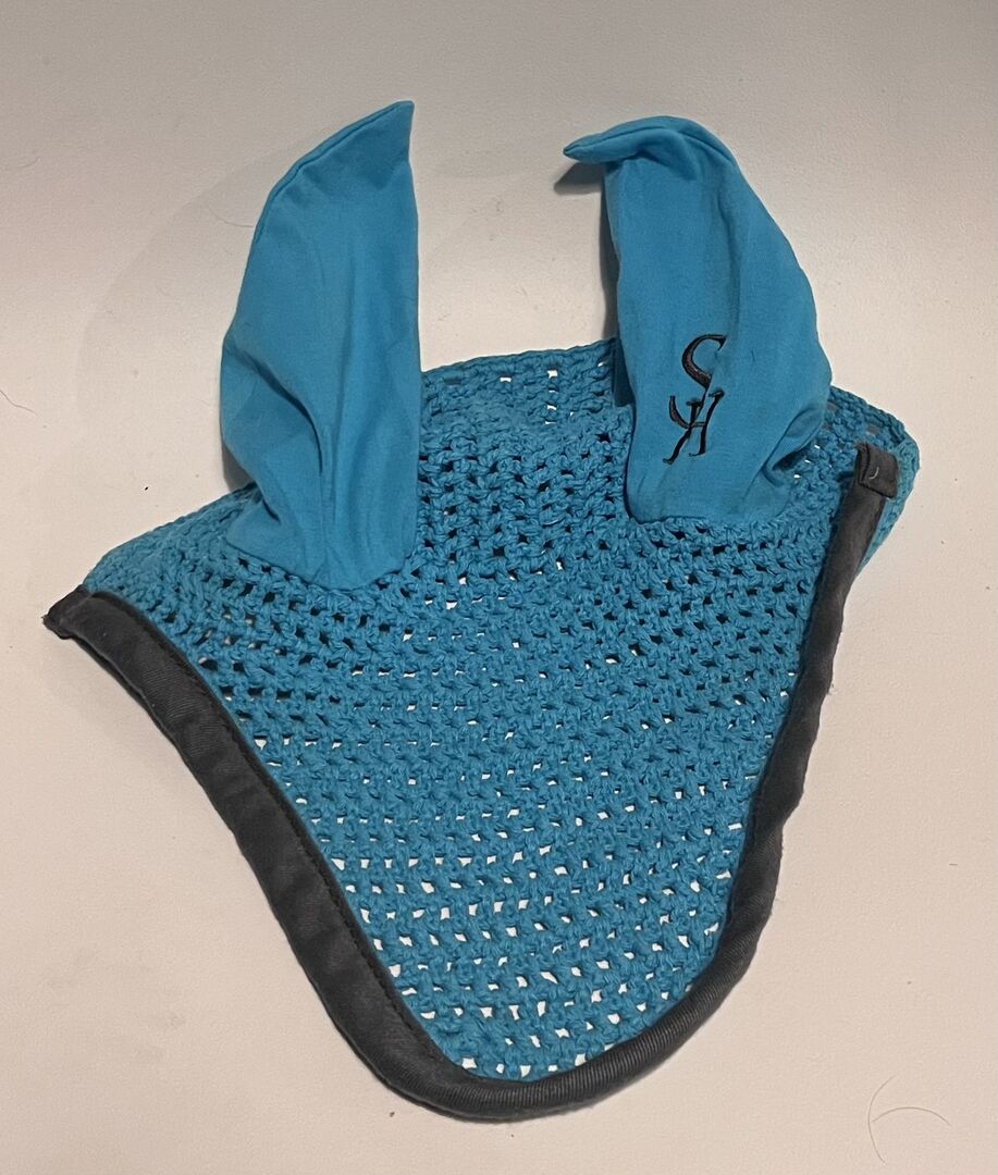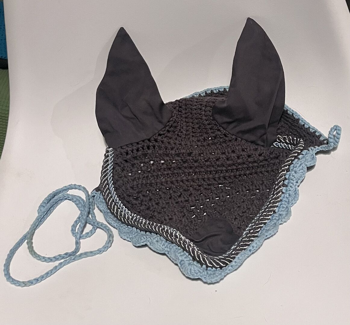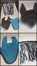 Vliegenbescherming voor cob/pony - Twee vliegenmutsen, een met klittenband en een met een koord. Er is ook een vliegenhoofdband. Alles past een Andalusiër, dus ik zou zeggen dat Cob de juiste maat heeft. Alles is fris gewassen en zonder gebreken.