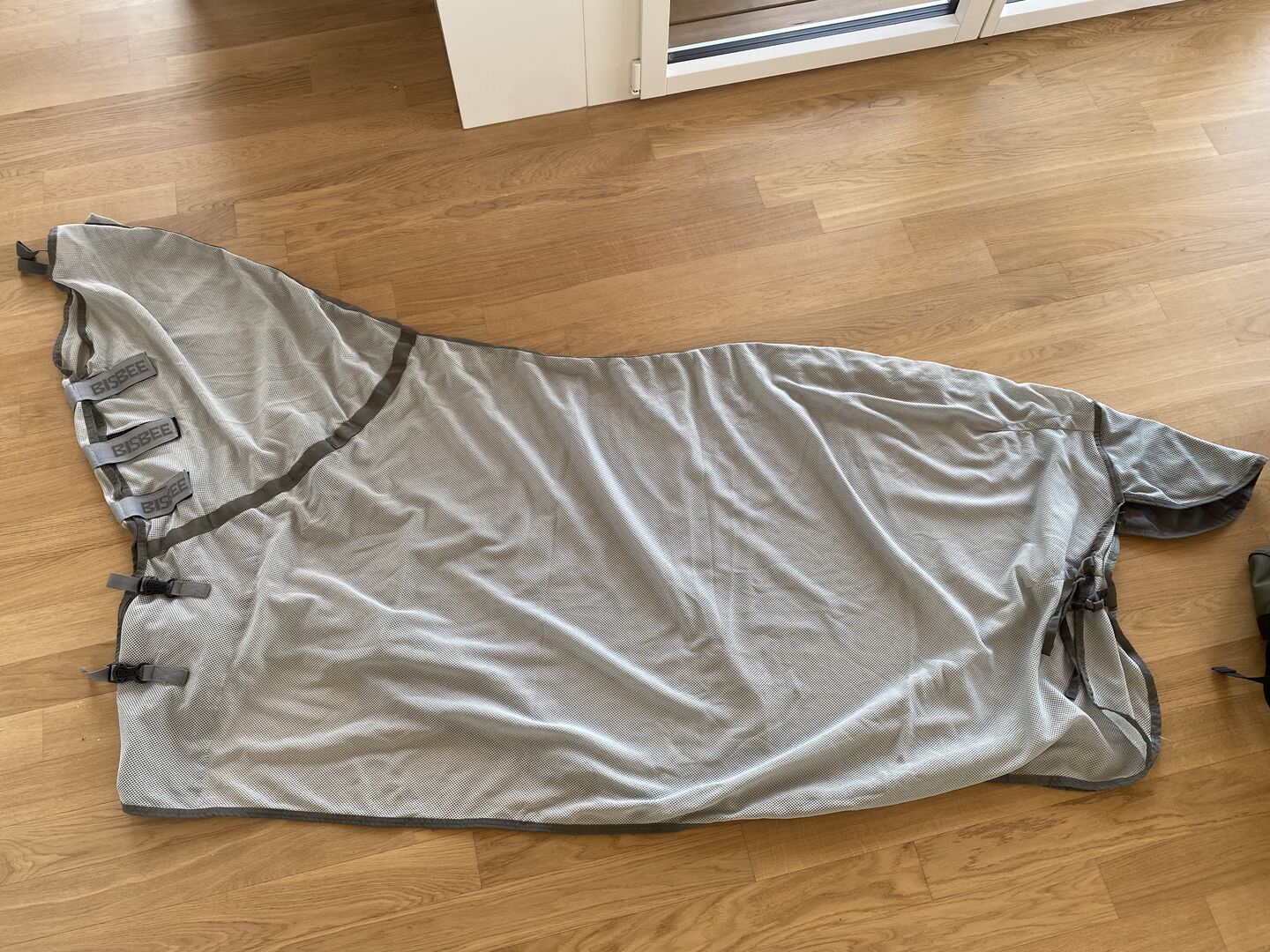 Vliegendeken 145cm - Grijs/zilveren vliegendeken met geïntegreerd halsstuk van Bisbee. Maat 145cm. Geen vlekken, gebreken of iets dergelijks. De deken heeft GEEN buikbanden.